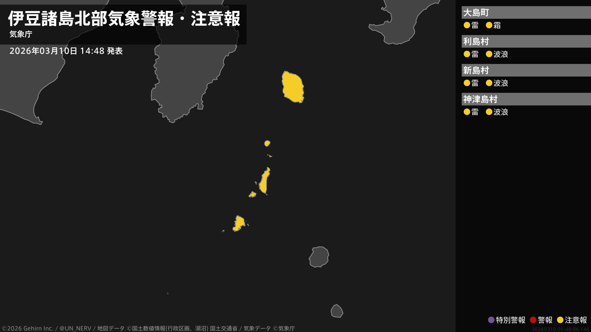 【東京都 気象警報・注意報 2026年03月10日 14:48】伊豆諸島北部、伊豆諸島南部では、高波や急な強い雨、落雷に注意してください。伊豆諸島北部では、霜に対する農作物の管理に注意してください。#気象警報注意報 #東京都