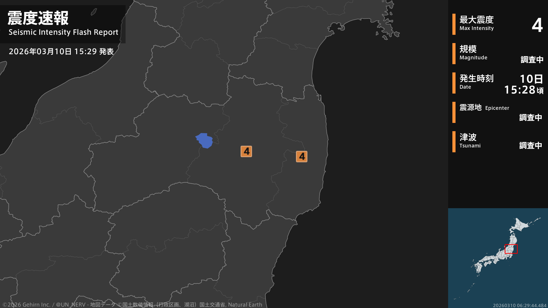 【緊急地震速報 第6報 2026年3月10日】15時28分頃、福島県沖を震源とする地震がありました。地震の規模はM4.5程度、最大震度4程度と推定されています。この情報は気象庁の予報に基づく推定です。情報は誤差を含む場合があります。#福島県 #緊急地震速報