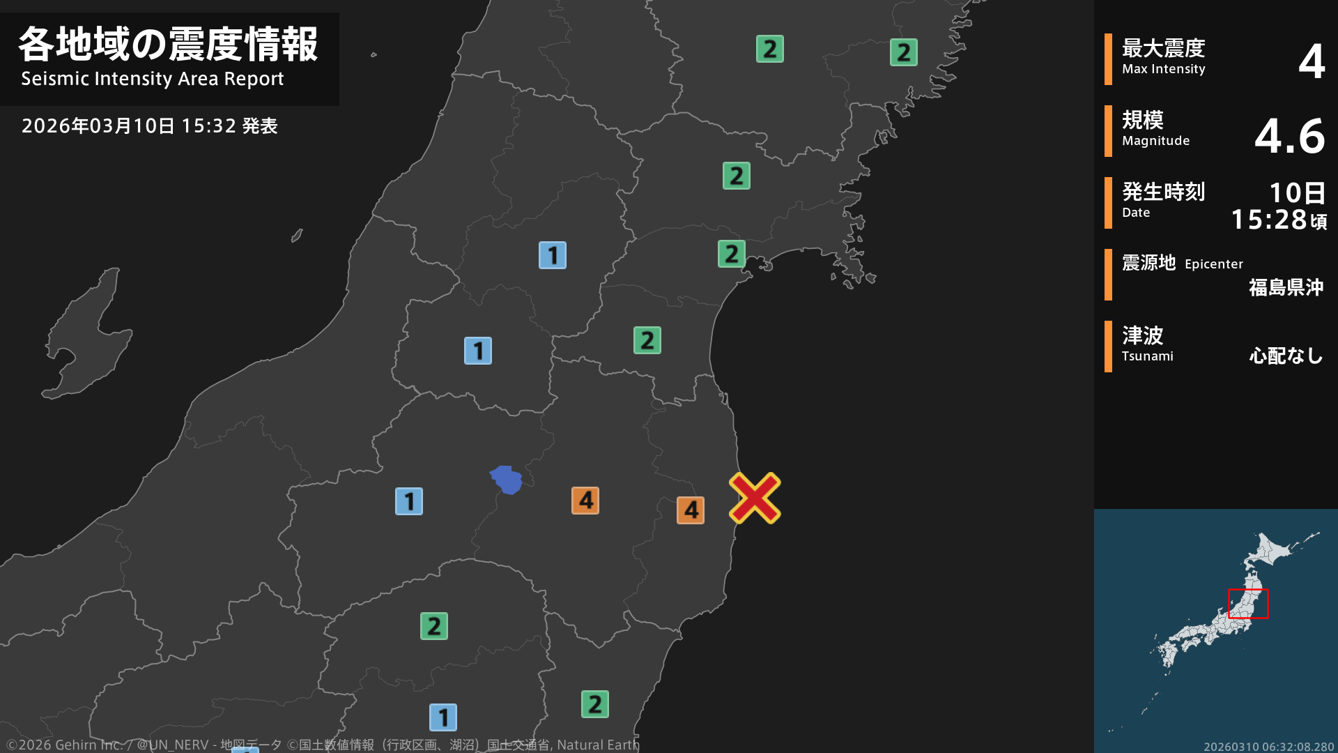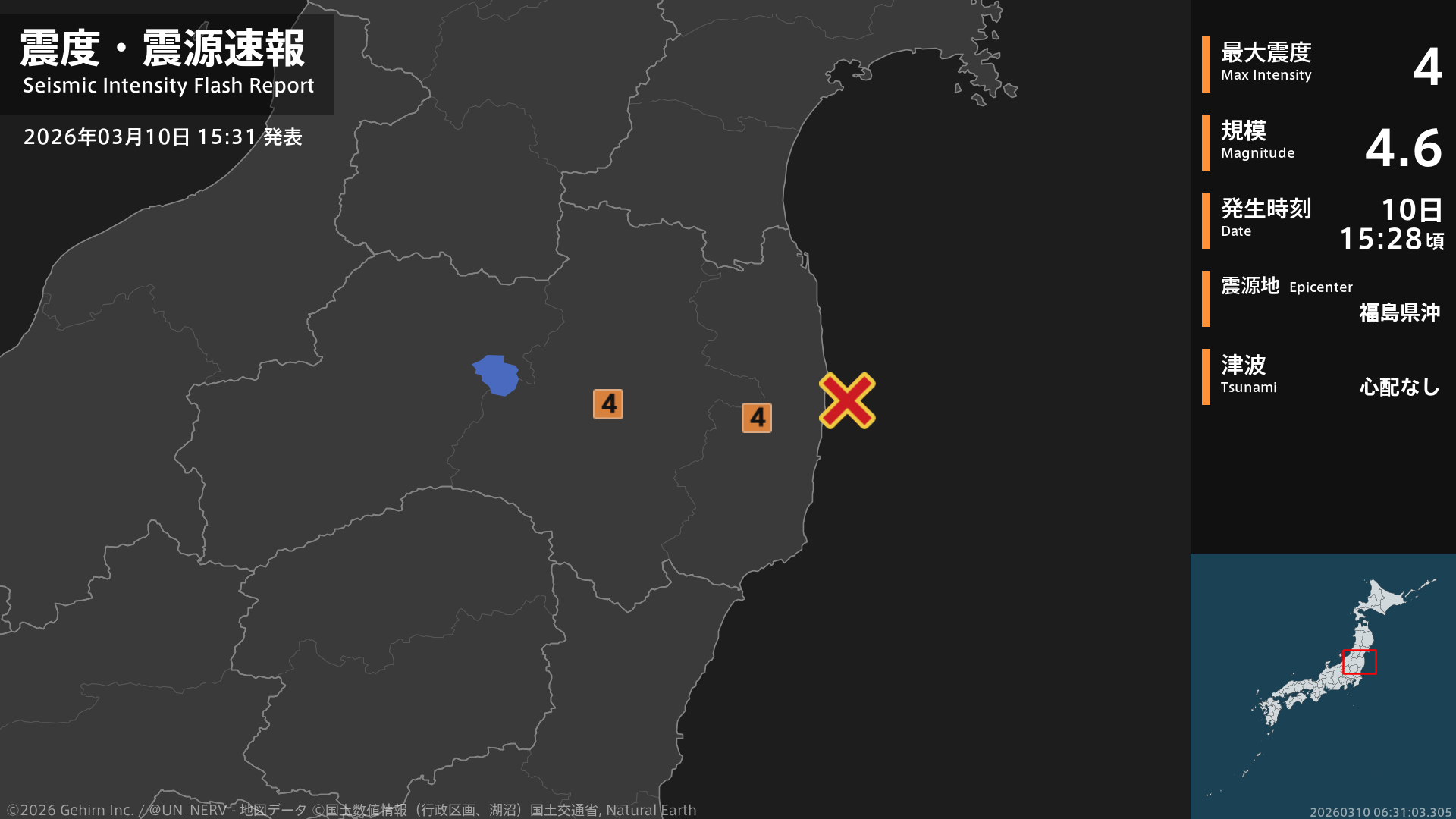 【震度・震源速報 2026年3月10日】15時28分頃、福島県沖を震源とする地震がありました。震源の深さは約60km、地震の規模はM4.6と推定されています。この地震による津波の心配はありません。#地震 #福島県