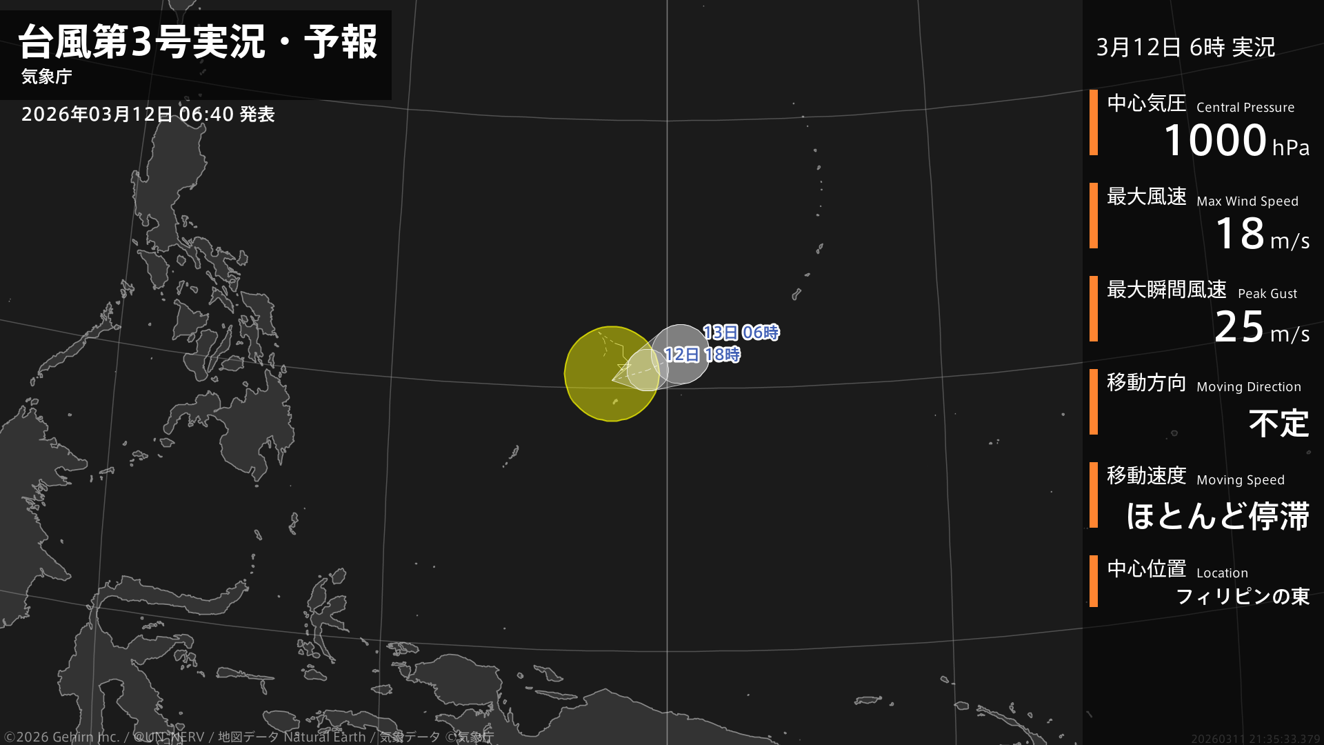 【台風第3号実況・予報 2026年03月12日 06:35】台風第3号(ヌーリ)は、フィリピンの東でほとんど停滞しています。#台風情報