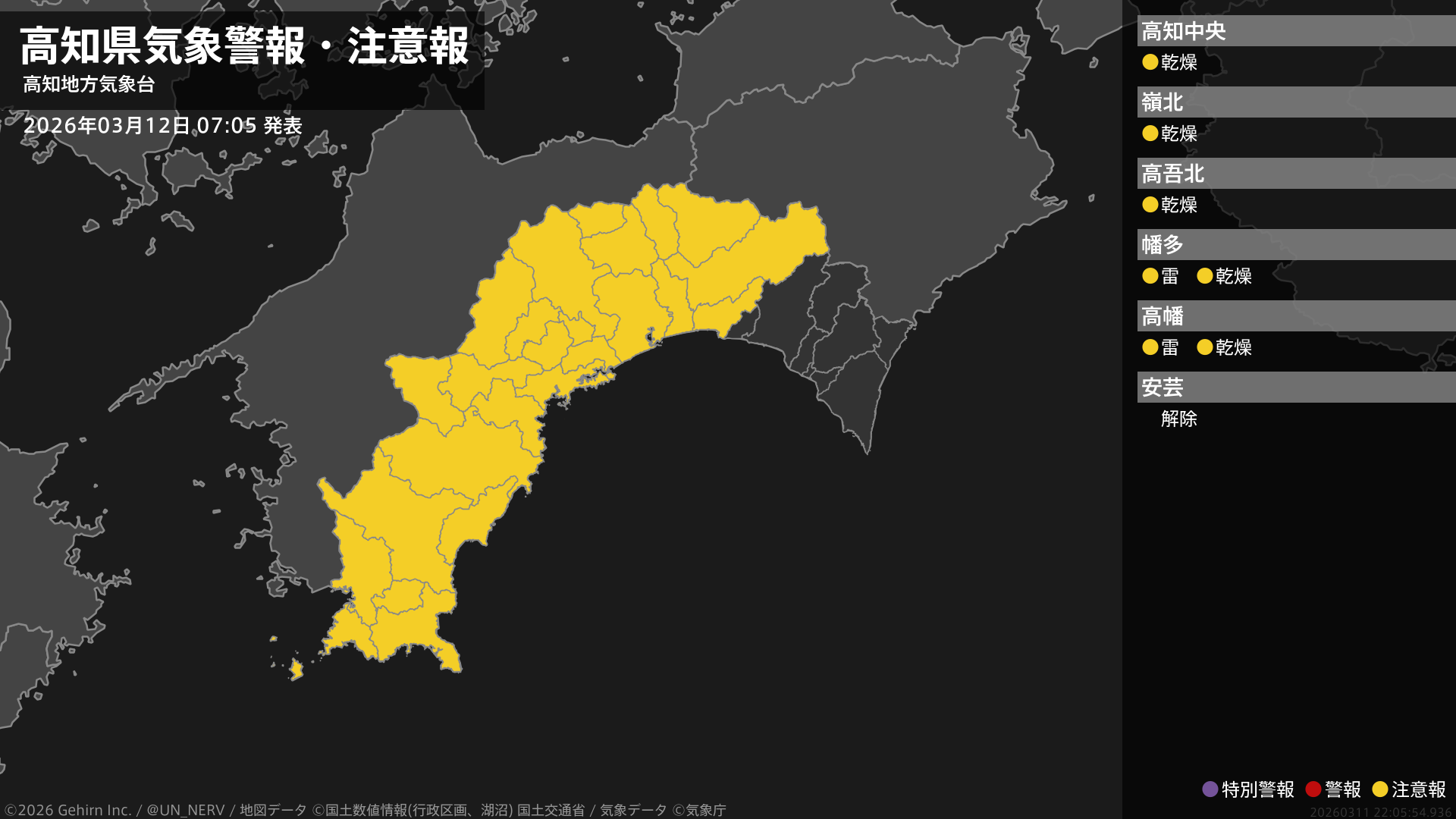 【高知県 気象警報・注意報 2026年03月12日 07:05】西部では、13日明け方まで急な強い雨や落雷に注意してください。中部、西部では、13日まで空気の乾燥した状態が続くため、火の取り扱いに注意してください。#気象警報注意報 #高知県