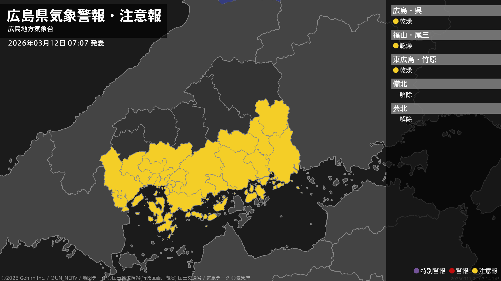 【広島県 気象警報・注意報 2026年03月12日 07:07】南部では、12日まで空気の乾燥した状態が続くため、火の取り扱いに注意してください。#気象警報注意報 #広島県
