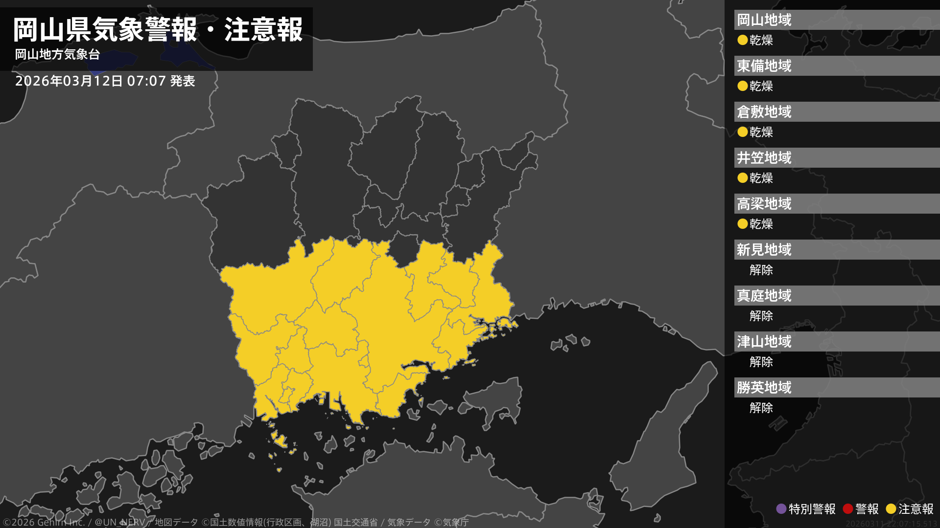 【岡山県 気象警報・注意報 2026年03月12日 07:07】南部では、12日まで空気の乾燥した状態が続くため、火の取り扱いに注意してください。#気象警報注意報 #岡山県