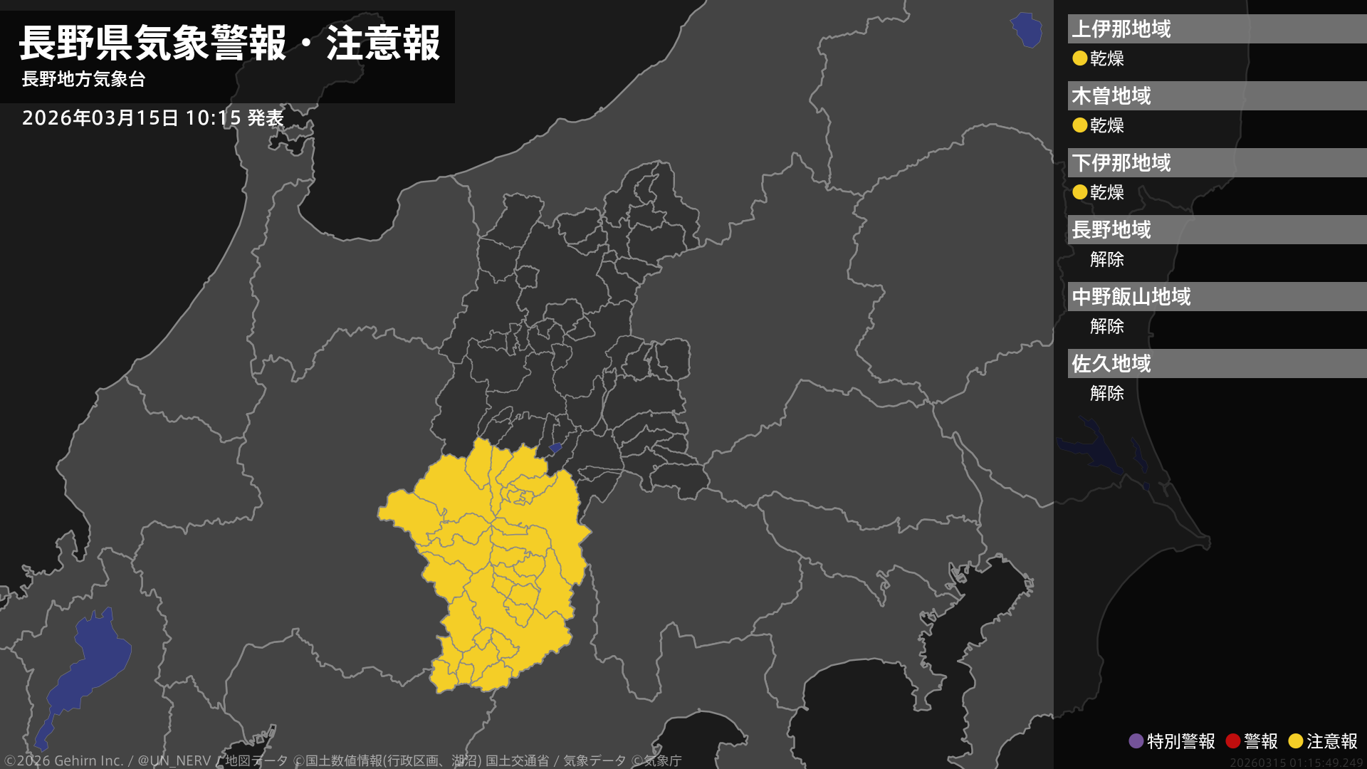 【長野県 気象警報・注意報 2026年03月15日 10:15】