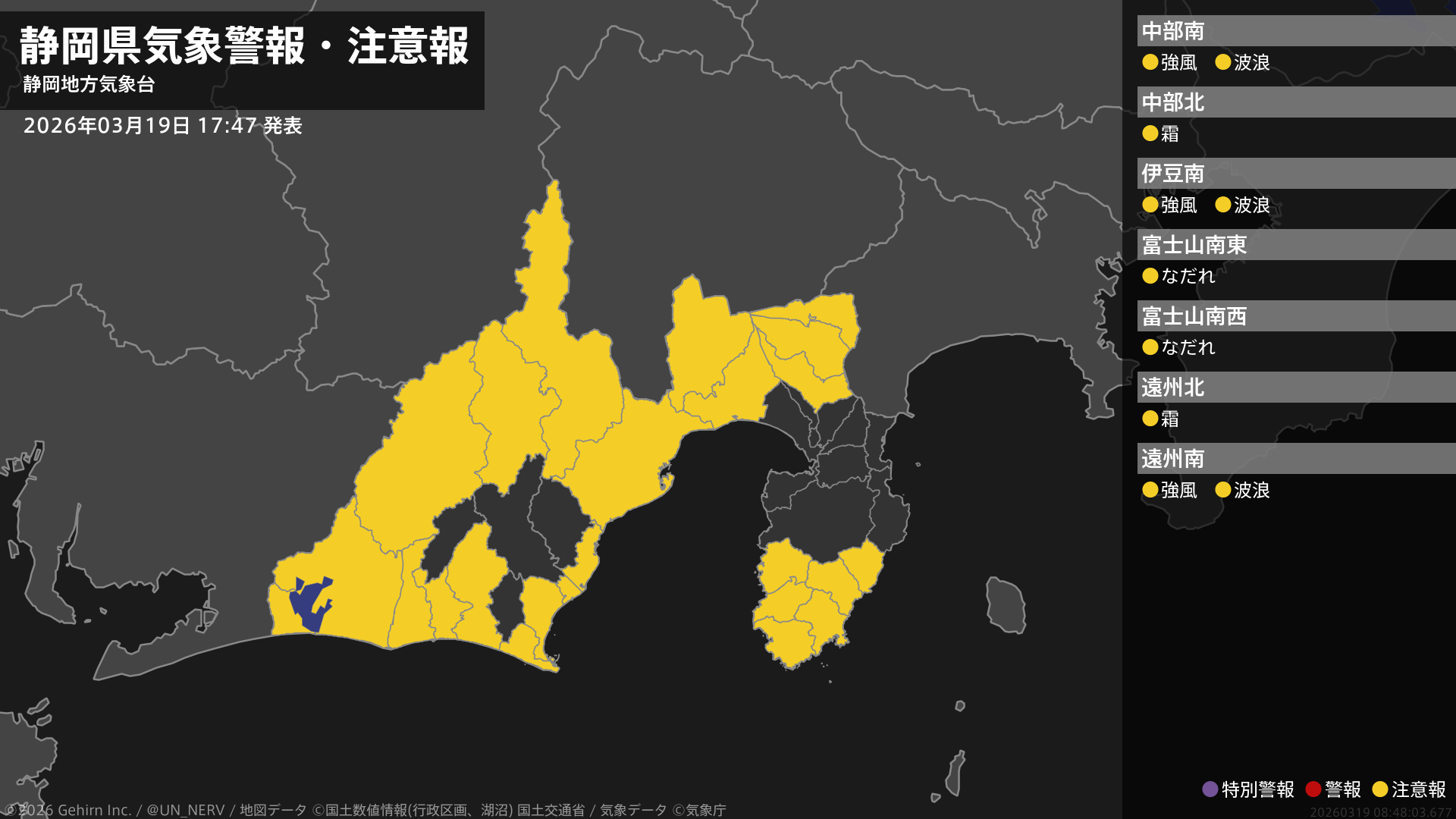 【静岡県 気象警報・注意報 2026年03月19日 17:48】