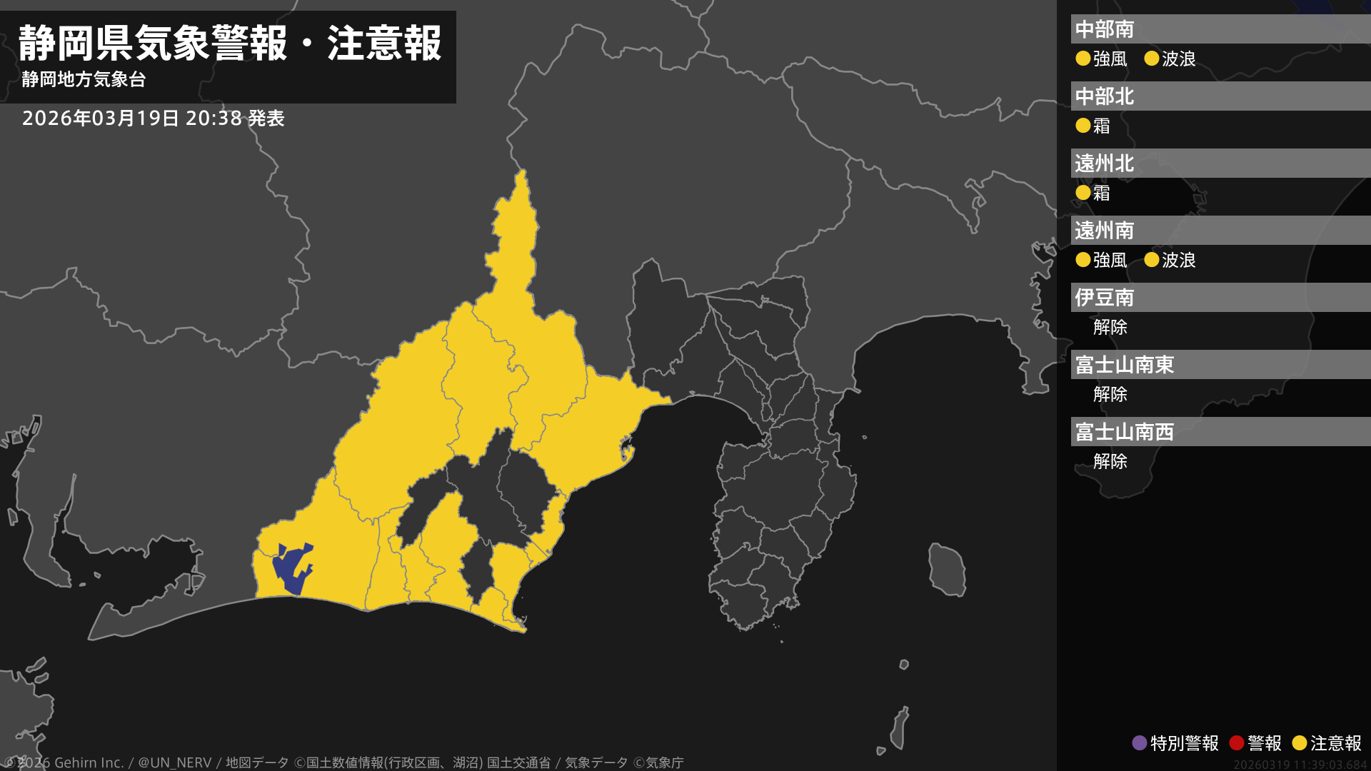 【静岡県 気象警報・注意報 2026年03月19日 20:39】中部、西部では、19日夜遅くまで強風や高波に、20日朝は霜に対する農作物の管理に注意してください。#気象警報注意報 #静岡県