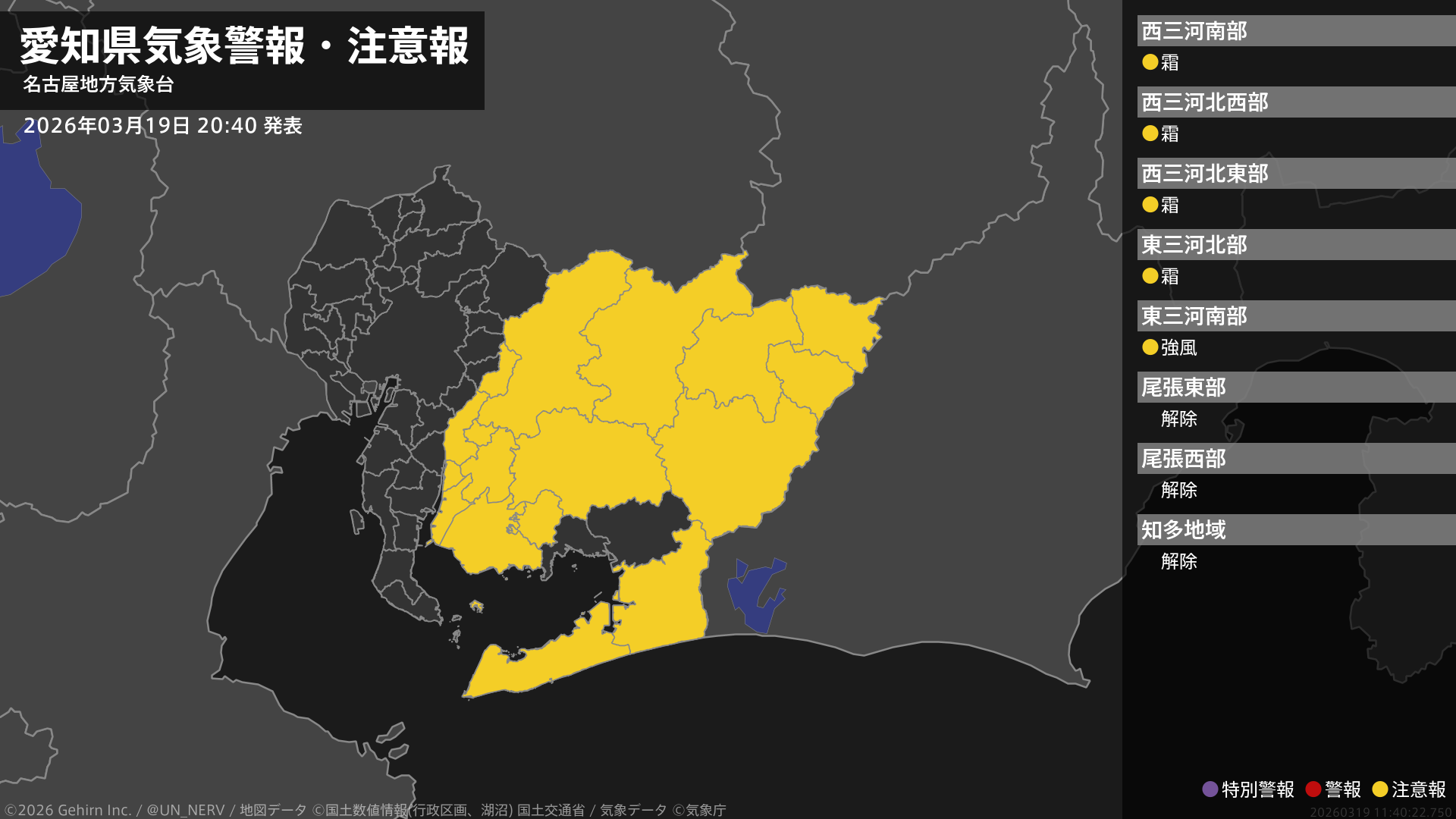 【愛知県 気象警報・注意報 2026年03月19日 20:40】東部では、19日夜遅くまで強風に注意してください。愛知県では、20日朝は霜に対する農作物の管理に注意してください。#気象警報注意報 #愛知県