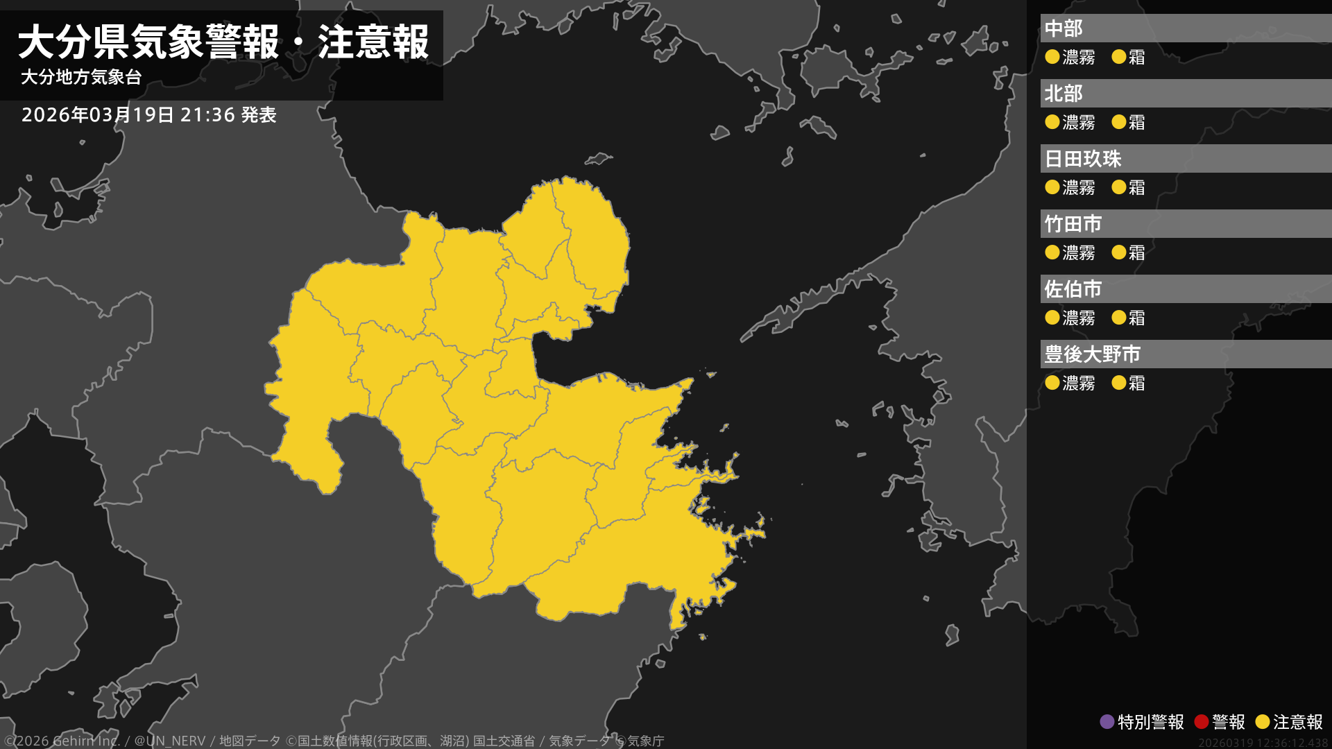 【大分県 気象警報・注意報 2026年03月19日 21:36】大分県では、20日未明から20日昼前まで濃霧による視程障害に、20日朝は霜に対する農作物の管理に注意してください。#気象警報注意報 #大分県