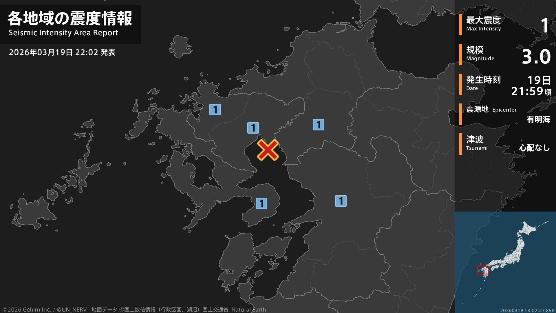 【地震情報 2026年3月19日】21時59分頃、有明海を震源とする地震がありました。震源の深さは約20km、地震の規模はM3.0、最大震度1を福岡県、佐賀県、長崎県、熊本県で観測しています。この地震による津波の心配はありません。#地震 #福岡県 #佐賀県 #長崎県 #熊本県