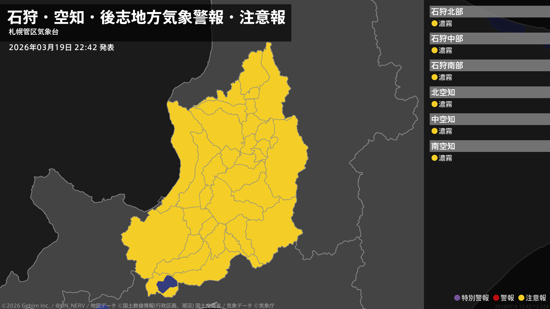 【石狩・空知・後志地方 気象警報・注意報 2026年03月19日 22:42】石狩、空知地方では、20日昼前まで濃霧による視程障害に注意してください。#気象警報注意報 #石狩地方 #空知地方