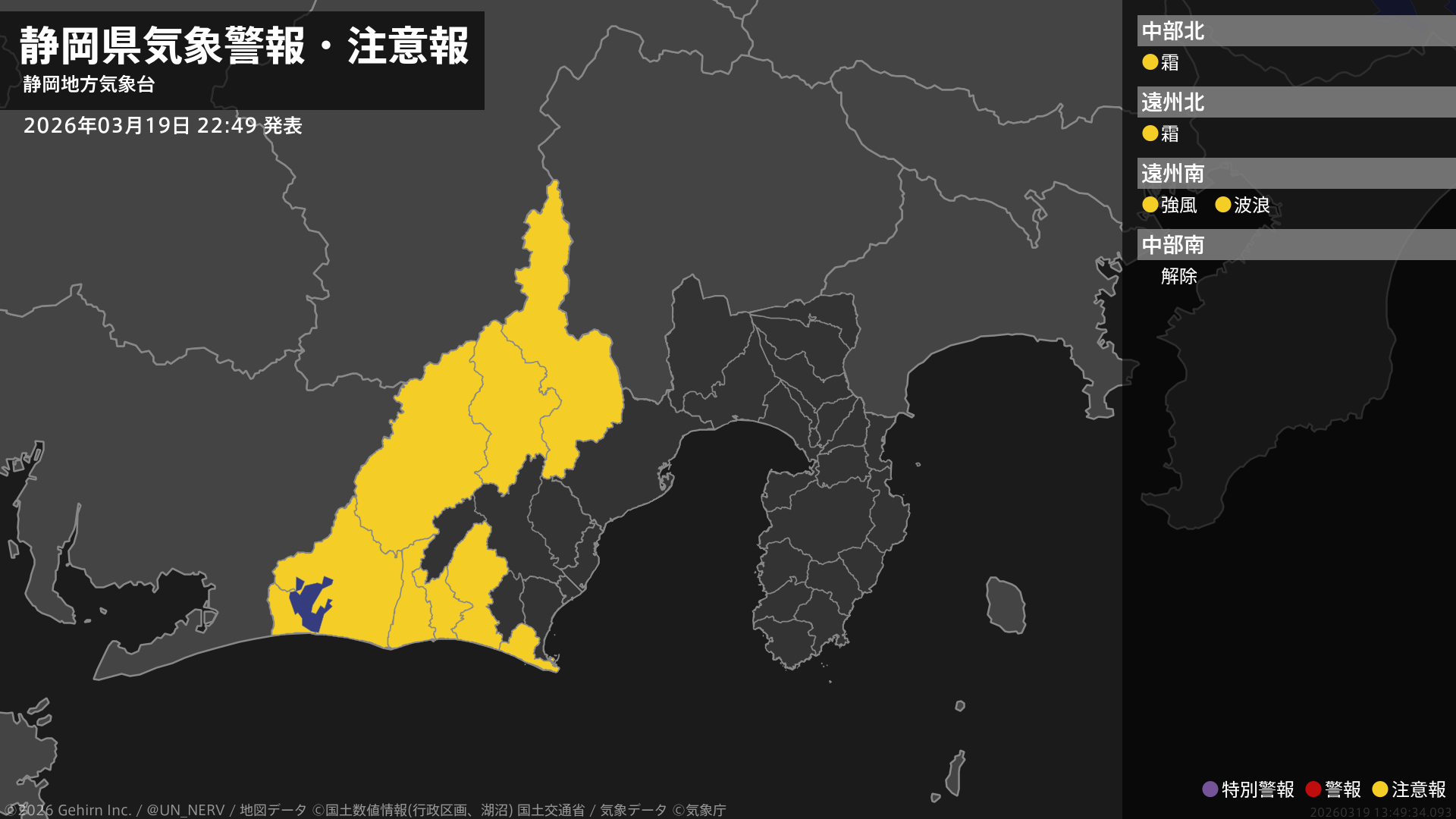 【静岡県 気象警報・注意報 2026年03月19日 22:49】西部では、20日明け方まで強風や高波に注意してください。中部、西部では、20日朝は霜に対する農作物の管理に注意してください。#気象警報注意報 #静岡県