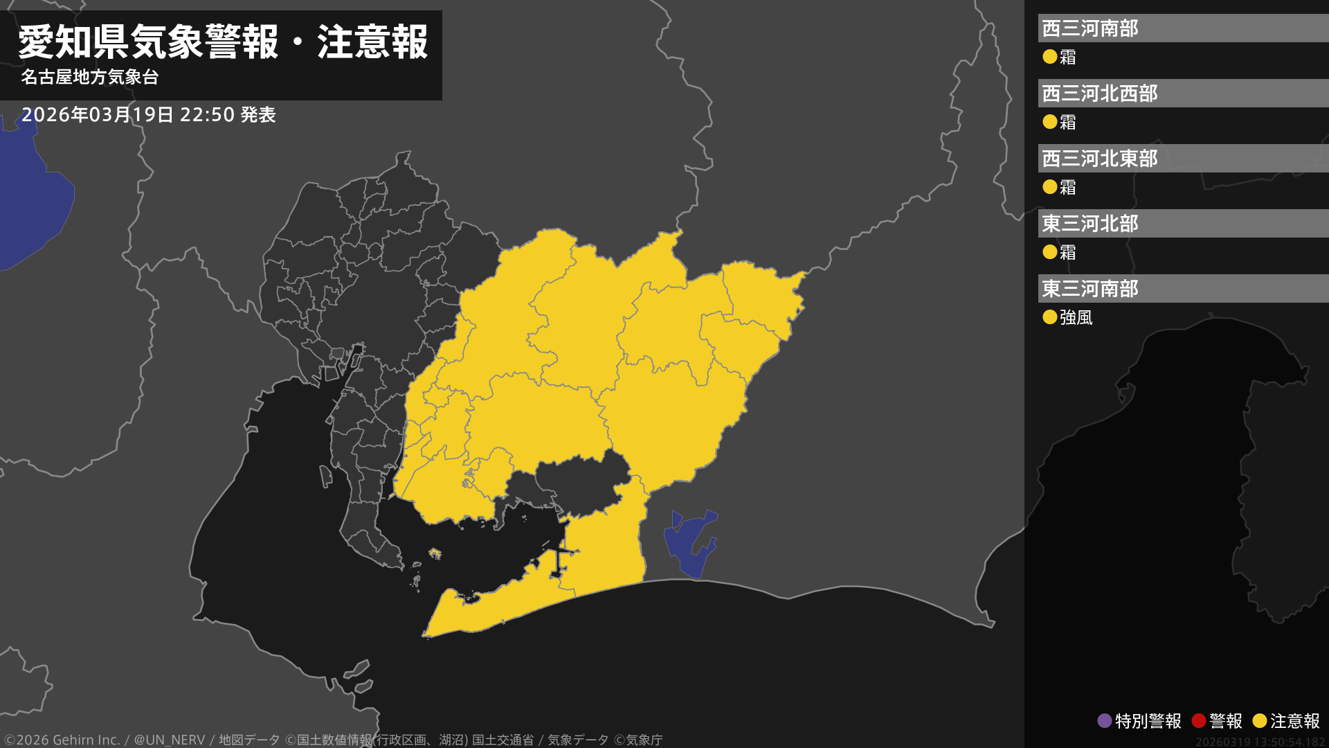 【愛知県 気象警報・注意報 2026年03月19日 22:50】東部では、20日明け方まで強風に注意してください。愛知県では、20日朝は霜に対する農作物の管理に注意してください。#気象警報注意報 #愛知県