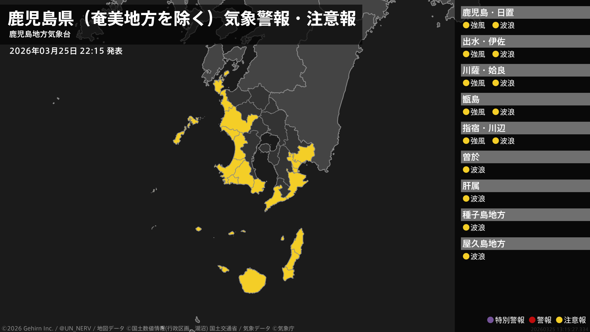 【鹿児島県(奄美地方を除く) 気象警報・注意報 2026年03月25日 22:15】薩摩地方では、26日明け方まで強風に注意してください。薩摩地方では26日明け方まで、大隅、種子島・屋久島地方では26日夕方まで、高波に注意してください。#気象警報注意報 #鹿児島県(奄美地方除く)
