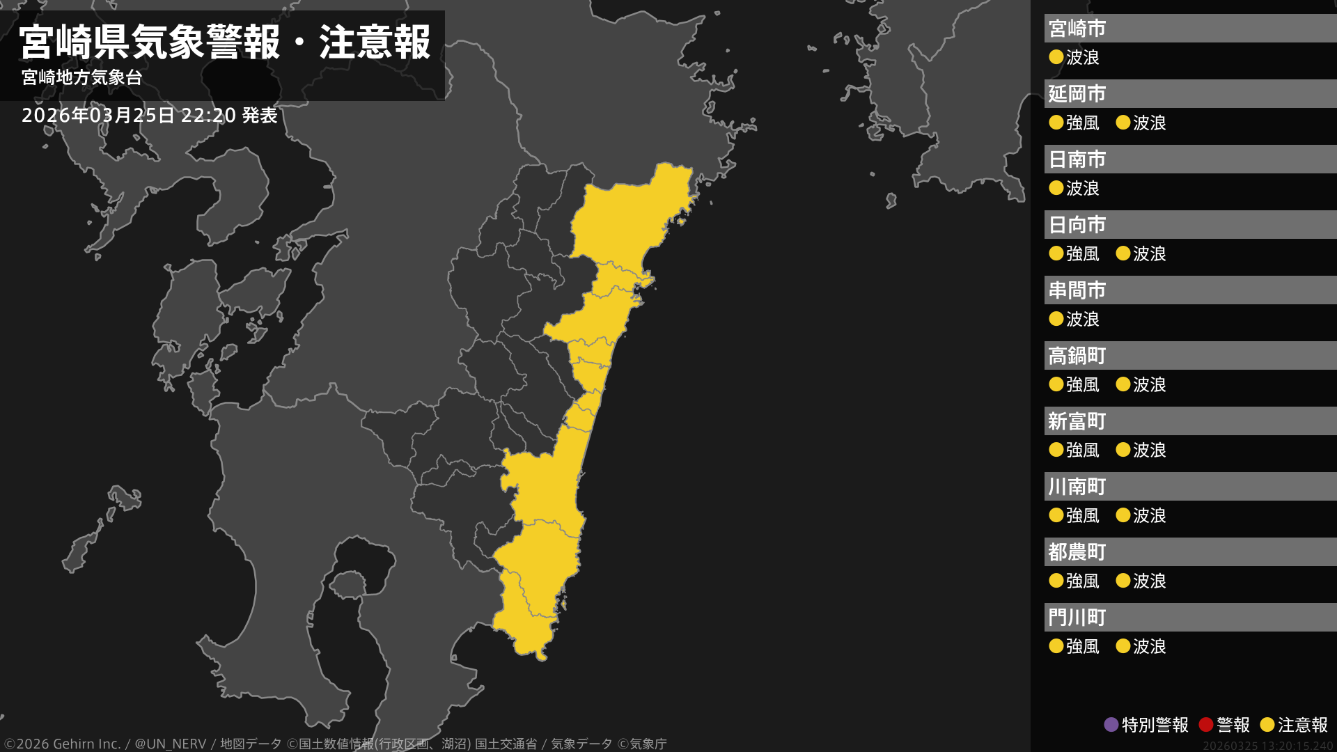 【宮崎県 気象警報・注意報 2026年03月25日 22:20】北部平野部では、26日明け方まで強風に注意してください。南部平野部、北部平野部では、26日夕方まで高波に注意してください。#気象警報注意報 #宮崎県