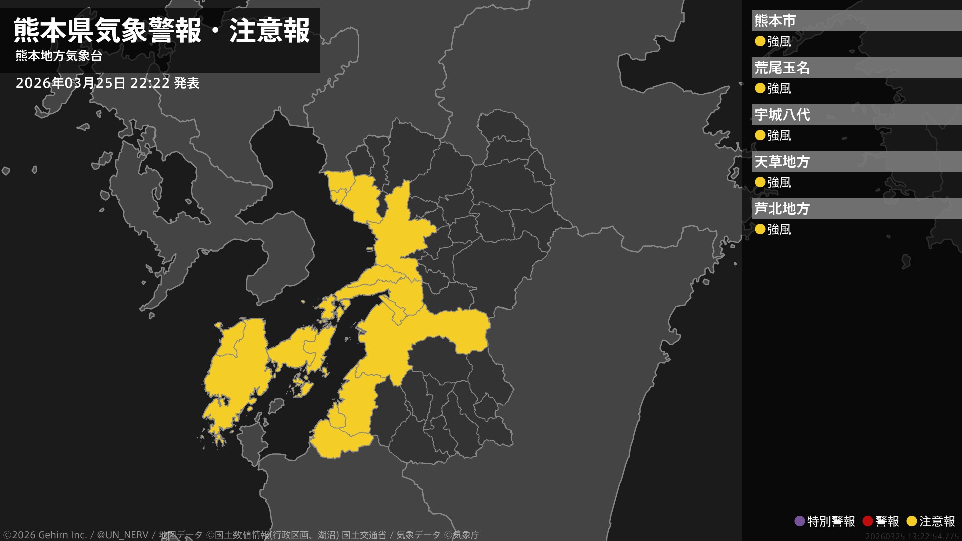 【熊本県 気象警報・注意報 2026年03月25日 22:22】熊本地方では26日朝まで、天草・芦北地方では26日夕方まで、強風に注意してください。#気象警報注意報 #熊本県