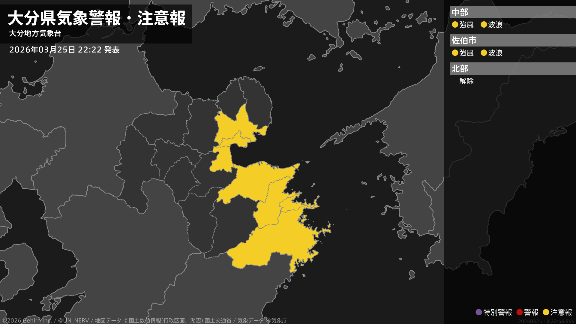 【大分県 気象警報・注意報 2026年03月25日 22:22】中部では26日昼前まで、南部では26日昼過ぎまで、強風に注意してください。中部では26日昼前まで、南部では26日夜遅くまで、高波に注意してください。#気象警報注意報 #大分県