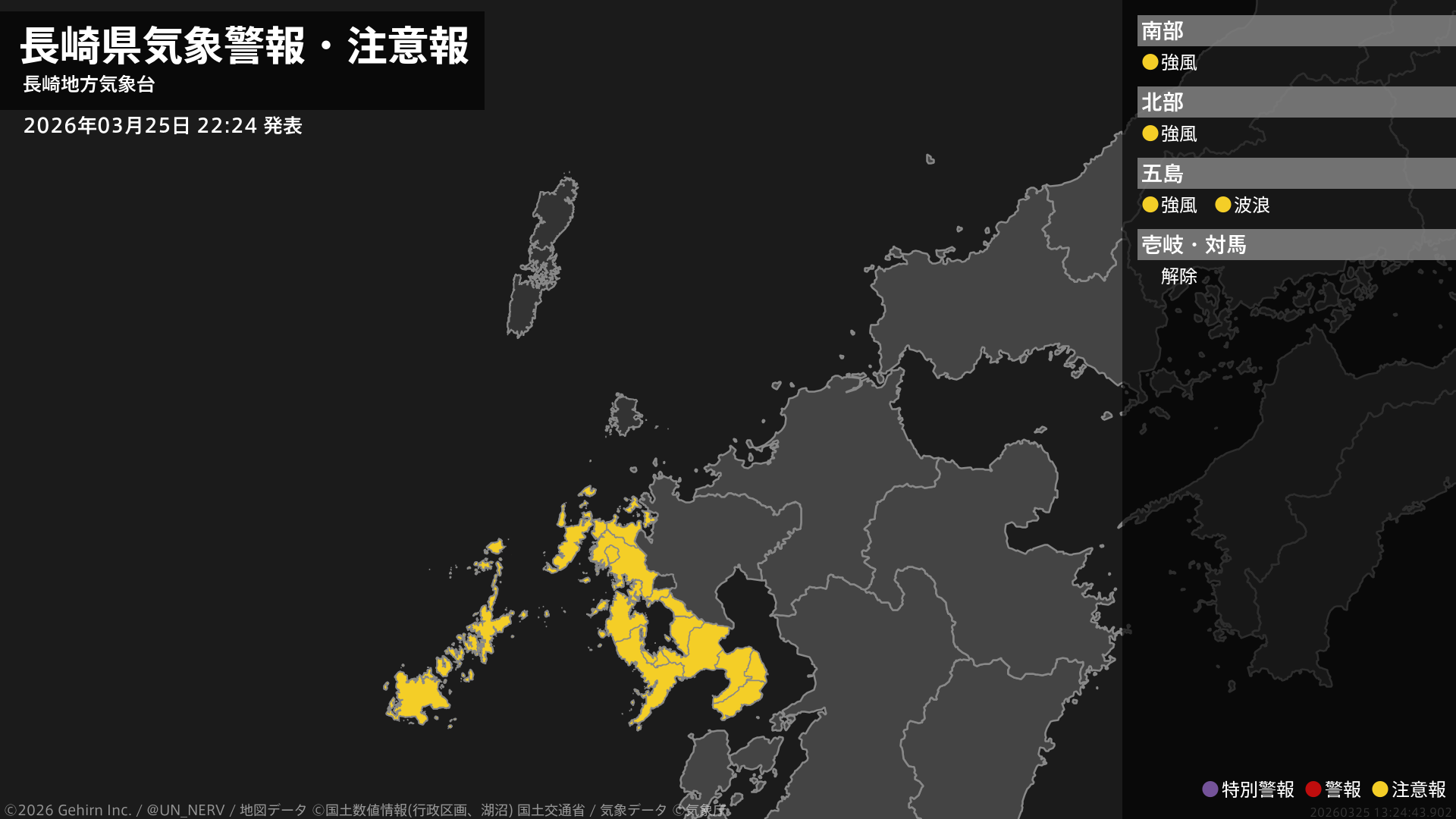 【長崎県 気象警報・注意報 2026年03月25日 22:24】北部、五島では26日朝まで、南部では26日夜のはじめ頃まで、強風に注意してください。五島では、26日明け方まで高波に注意してください。#気象警報注意報 #長崎県