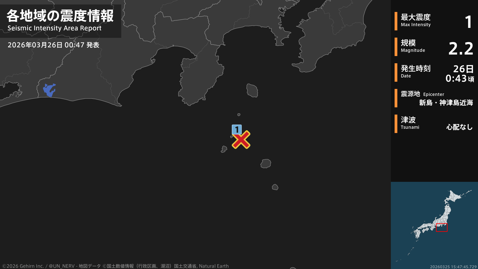 【地震情報 2026年3月26日】0時43分頃、新島・神津島近海を震源とする地震がありました。震源の深さはごく浅い、地震の規模はM2.2、最大震度1を東京都で観測しています。この地震による津波の心配はありません。#地震 #東京都