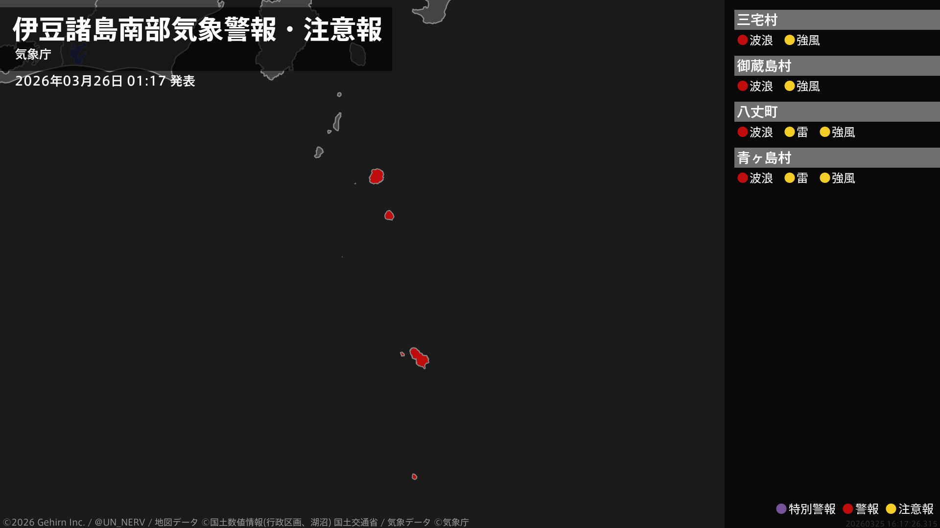 【東京都 気象警報・注意報 2026年03月26日 01:17】伊豆諸島南部では、26日朝から26日夕方まで高波に警戒してください。#気象警報注意報 #東京都
