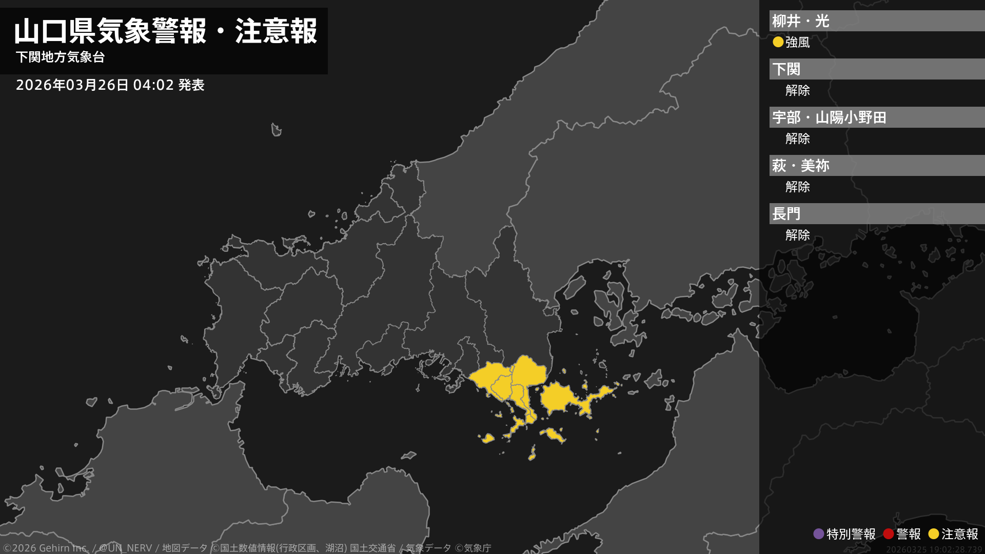 【山口県 気象警報・注意報 2026年03月26日 04:02】東部では、26日夜のはじめ頃まで強風に注意してください。#気象警報注意報 #山口県