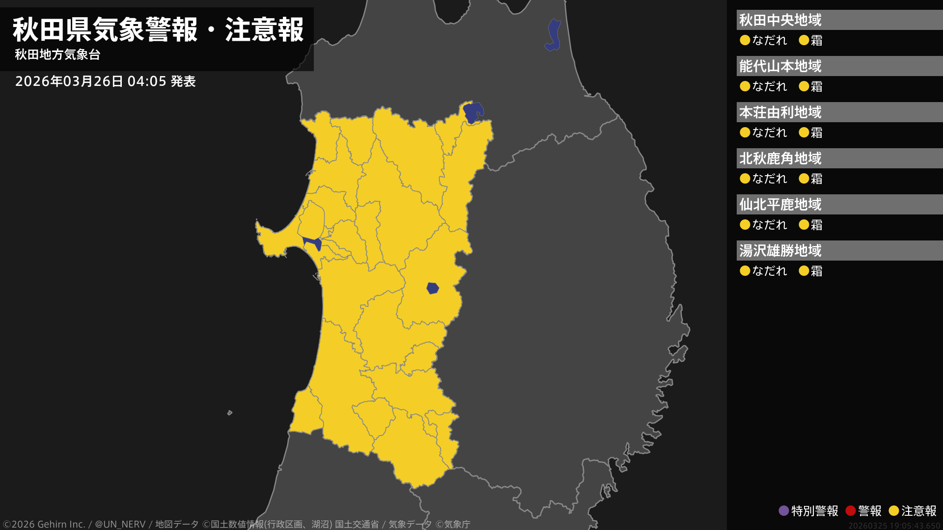 【秋田県 気象警報・注意報 2026年03月26日 04:05】秋田県では、ここしばらくなだれに、26日朝は霜に対する農作物の管理に注意してください。#気象警報注意報 #秋田県