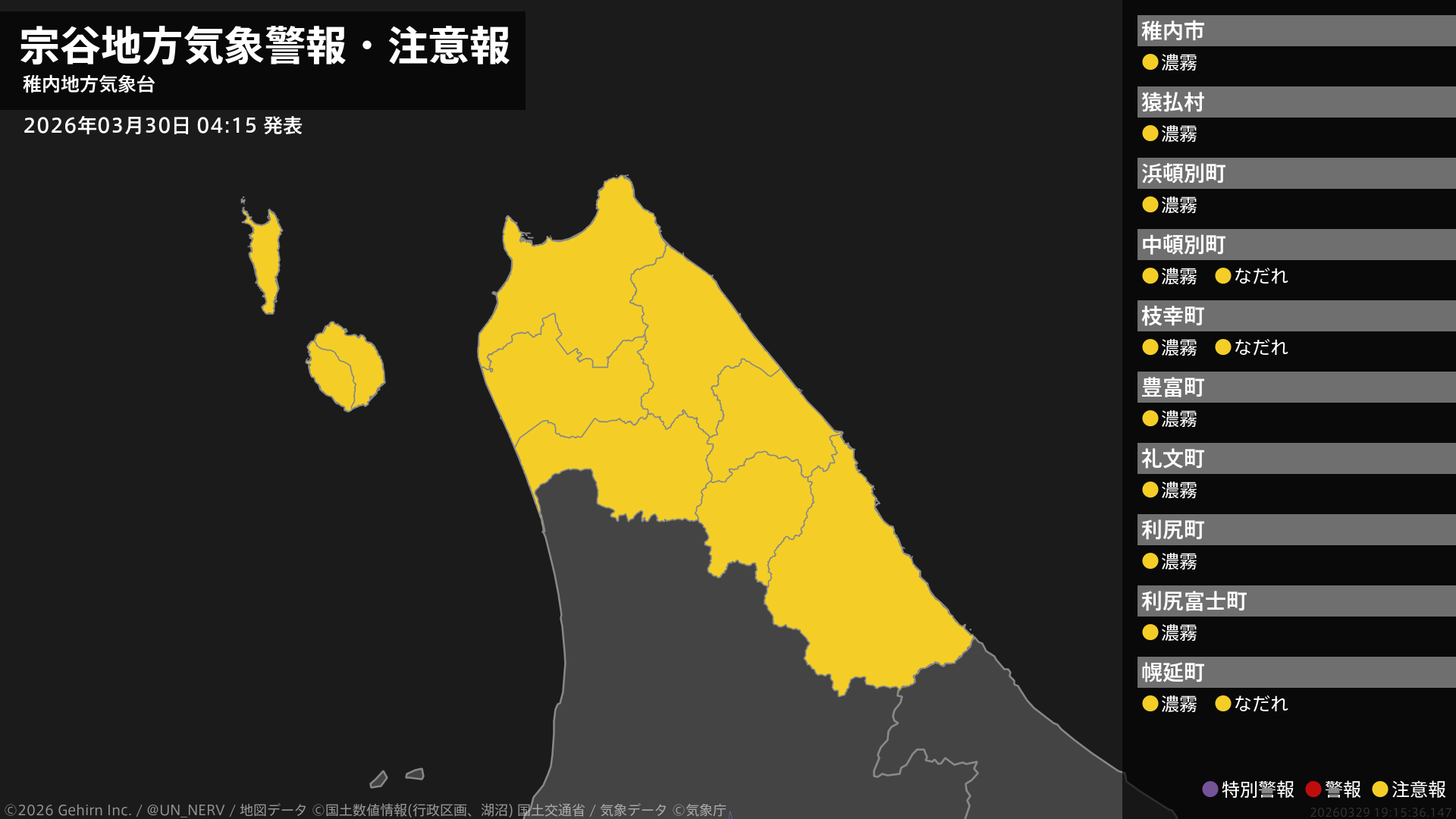 【宗谷地方 気象警報・注意報 2026年03月30日 04:15】宗谷地方では、30日昼前まで濃霧による視程障害に、30日までなだれに注意してください。#気象警報注意報 #宗谷地方