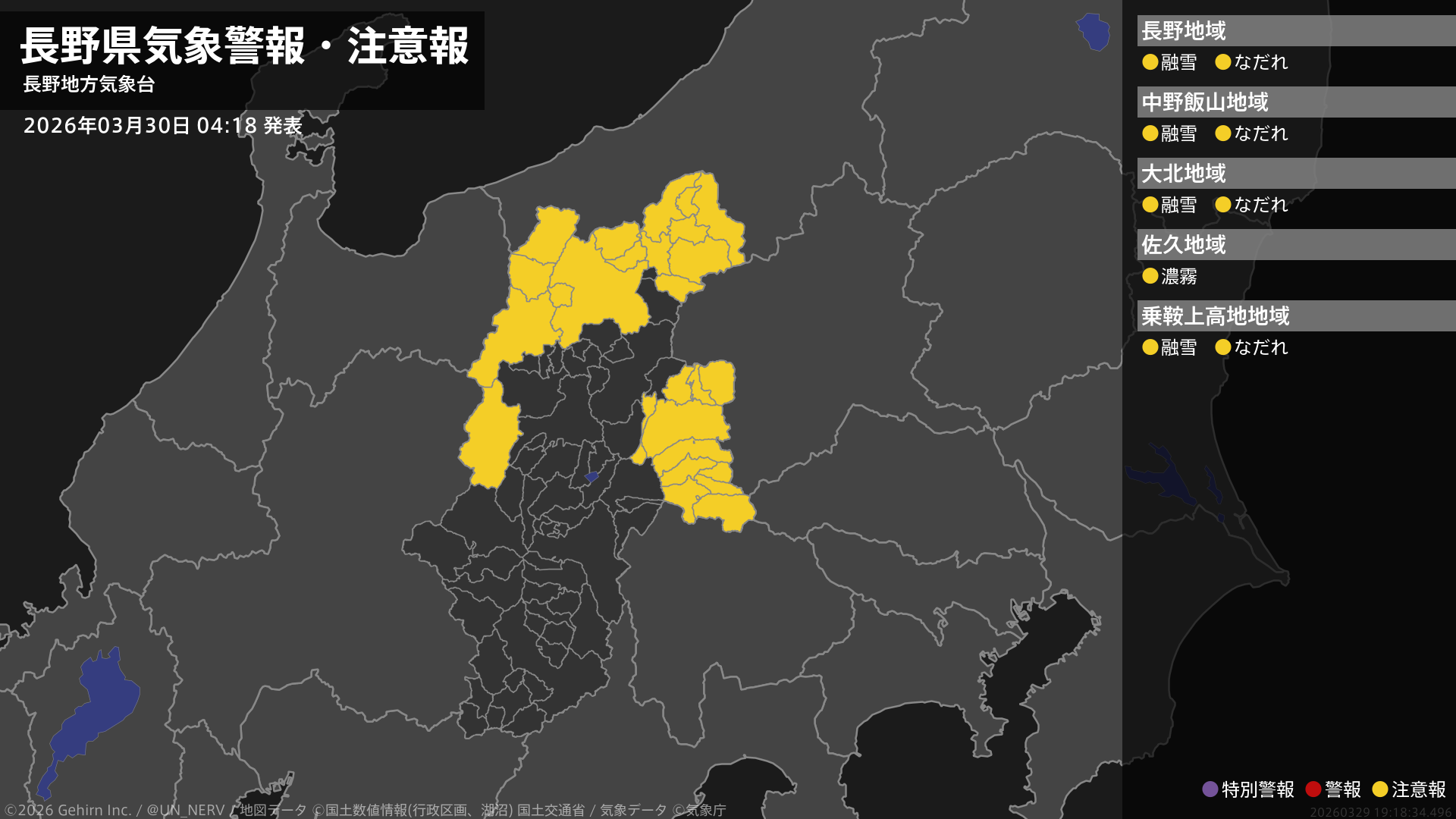 【長野県 気象警報・注意報 2026年03月30日 04:18】北部、中部では、融雪による土砂災害やなだれに注意してください。中部では、濃霧による視程障害に注意してください。#気象警報注意報 #長野県