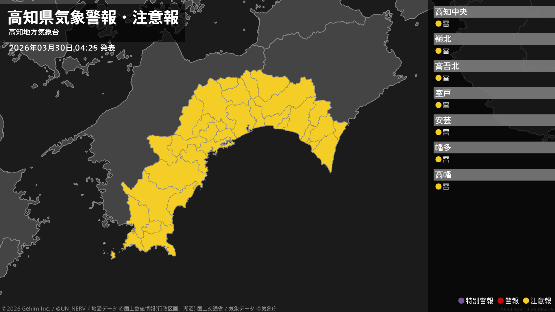 【高知県 気象警報・注意報 2026年03月30日 04:25】高知県では、30日昼前まで急な強い雨や落雷に注意してください。#気象警報注意報 #高知県