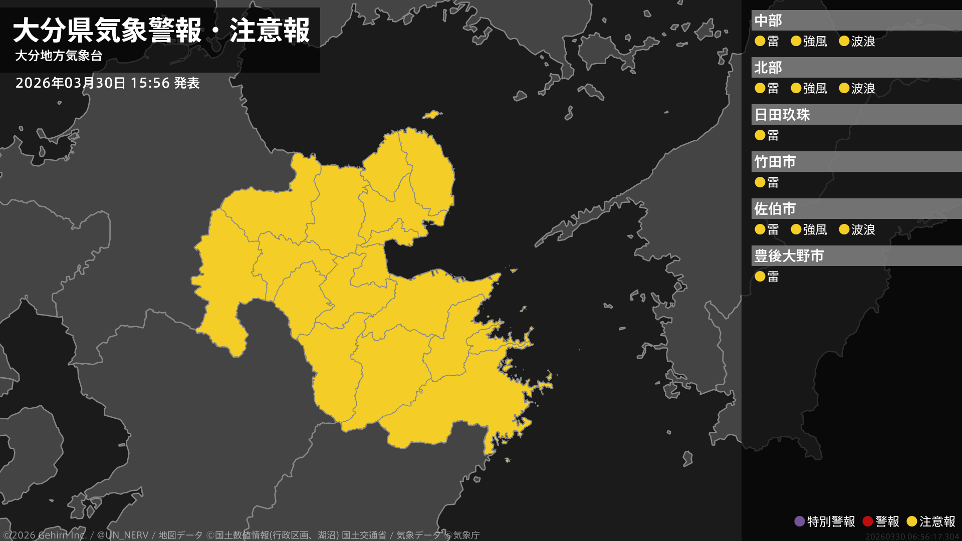 【大分県 気象警報・注意報 2026年03月30日 15:56】中部、北部、南部では、強風や高波に注意してください。大分県では、竜巻などの激しい突風や急な強い雨、落雷に注意してください。#気象警報注意報 #大分県