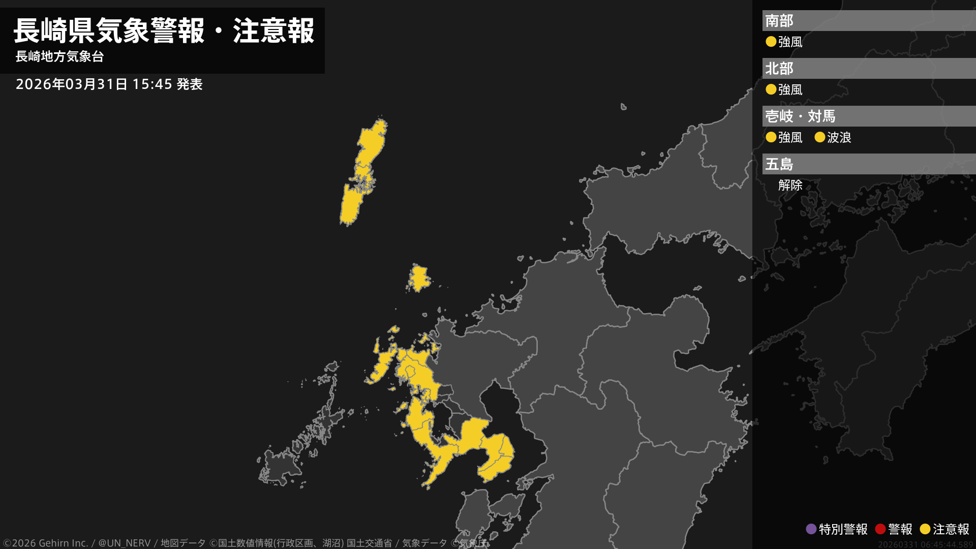 【長崎県 気象警報・注意報 2026年03月31日 15:45】北部、壱岐・対馬では31日夜遅くまで、南部では1日明け方まで、強風に注意してください。壱岐・対馬では、1日明け方まで高波に注意してください。#気象警報注意報 #長崎県