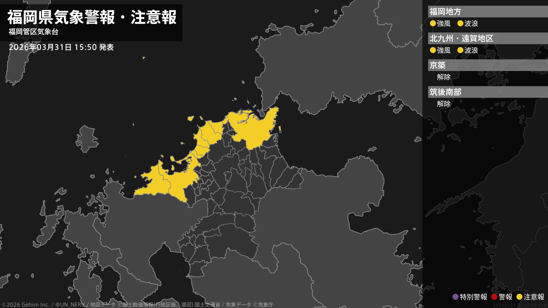 【福岡県 気象警報・注意報 2026年03月31日 15:50】福岡、北九州地方では、31日夜遅くまで強風に、1日明け方まで高波に注意してください。#気象警報注意報 #福岡県