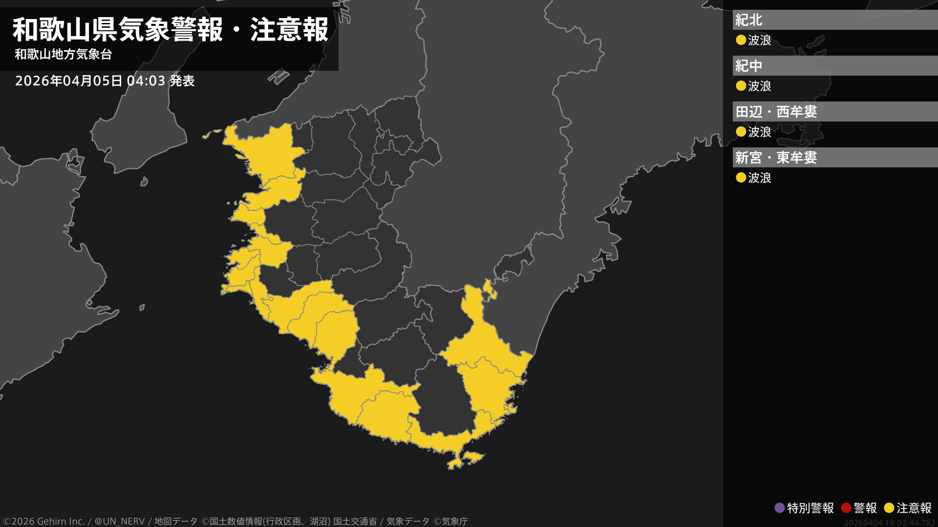 【和歌山県 気象警報・注意報 2026年04月05日 04:03】北部では5日昼前まで、南部では5日夜遅くまで、高波に注意してください。#気象警報注意報 #和歌山県