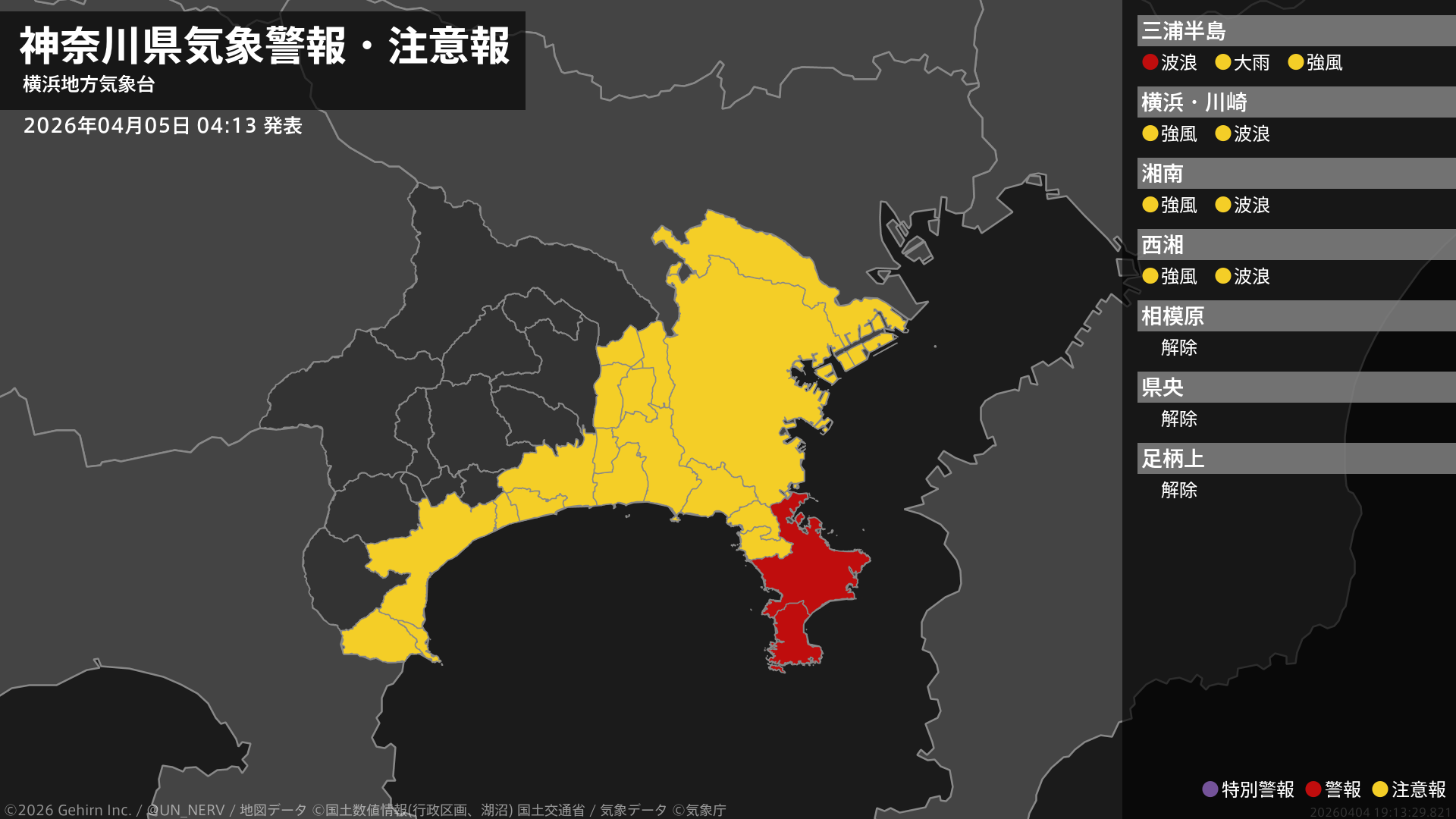 【神奈川県 気象警報・注意報 2026年04月05日 04:13】東部では、5日昼前まで高波に警戒してください。#気象警報注意報 #神奈川県