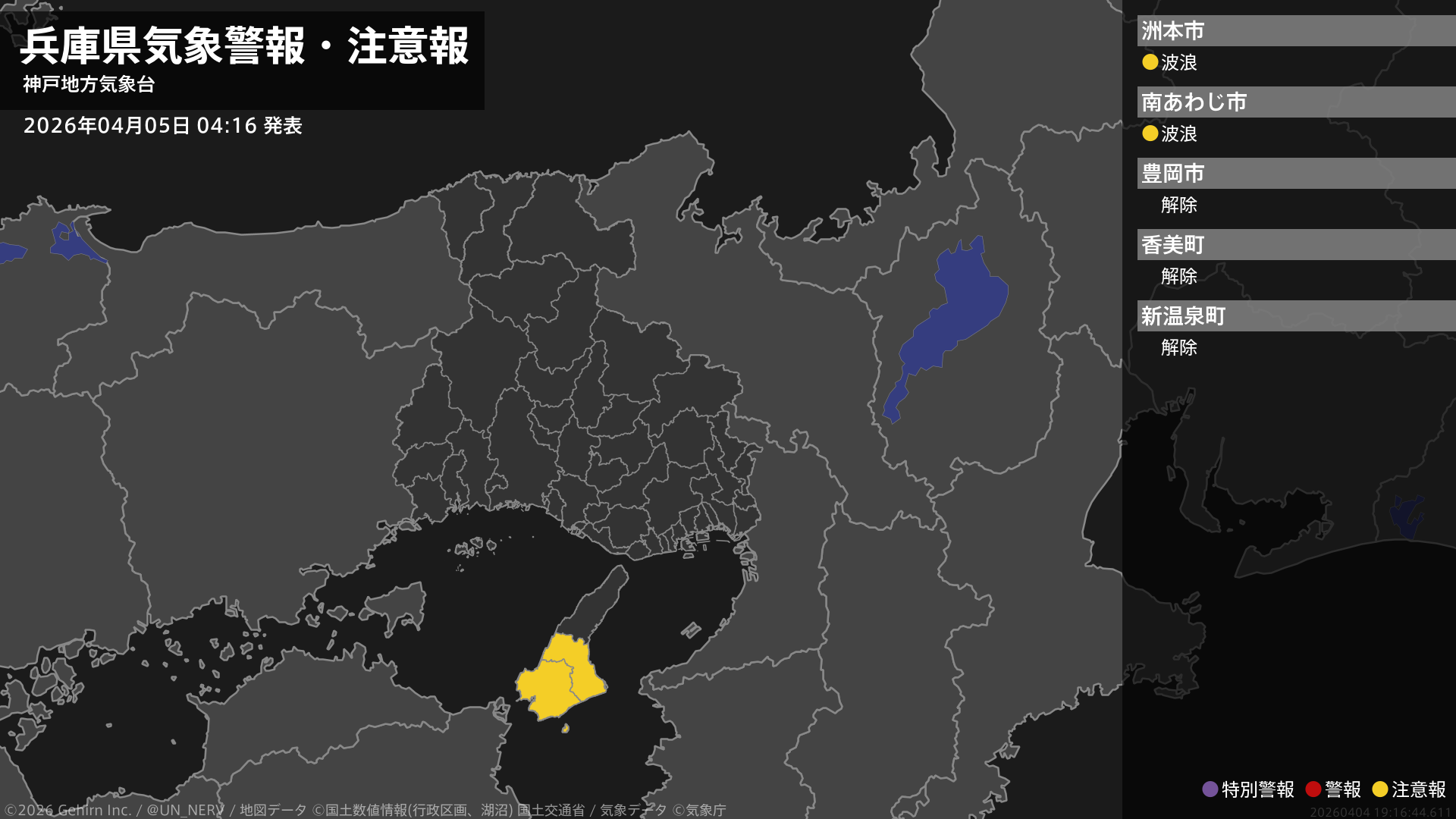【兵庫県 気象警報・注意報 2026年04月05日 04:16】南部では、5日夜遅くまで高波に注意してください。#気象警報注意報 #兵庫県