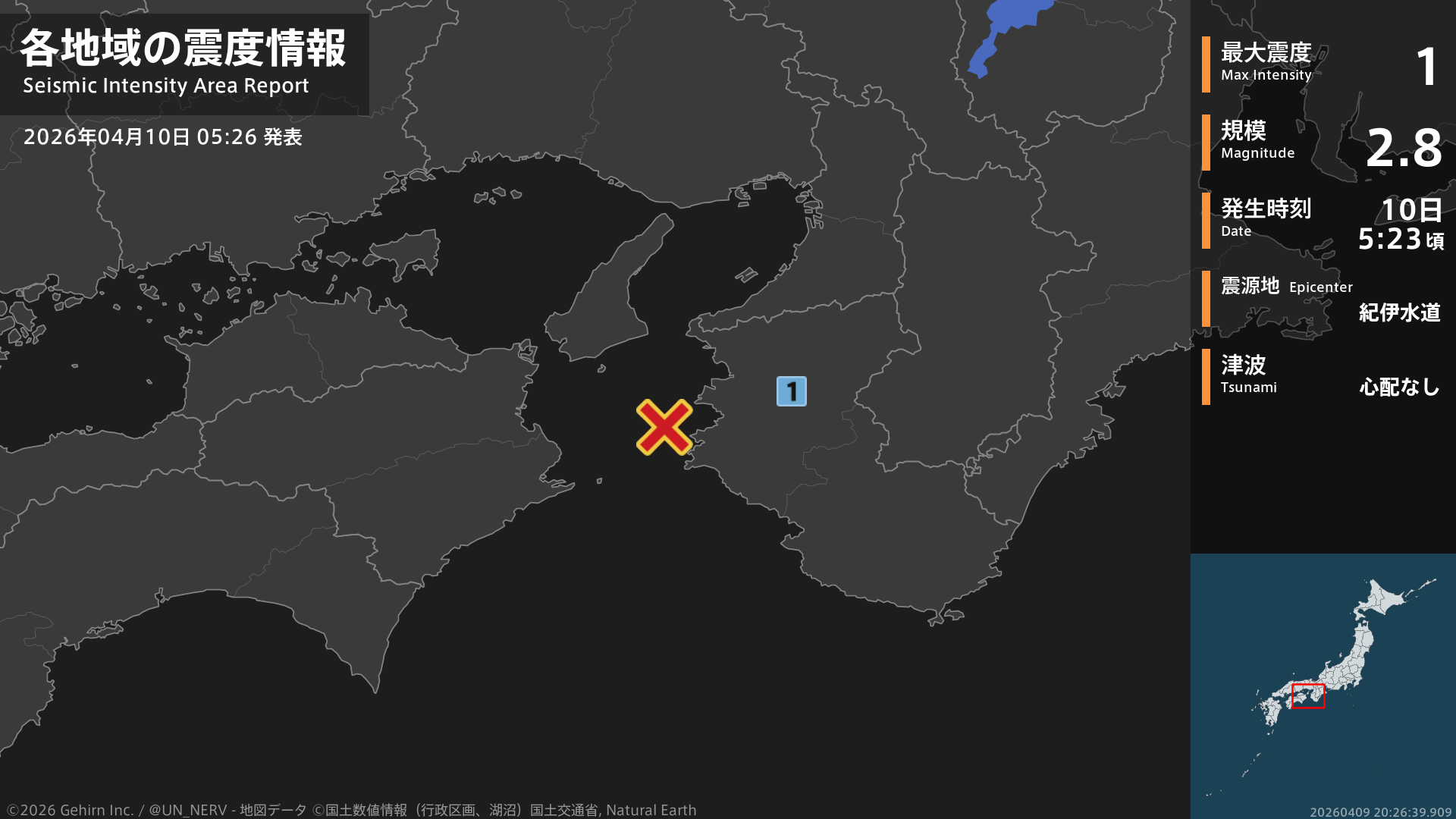 5時23分頃、紀伊水道を震源とする地震がありました。震源の深さは約10km、地震の規模はM2.8、最大震度1を和歌山県で観測しています。この地震による津波の心配はありません。