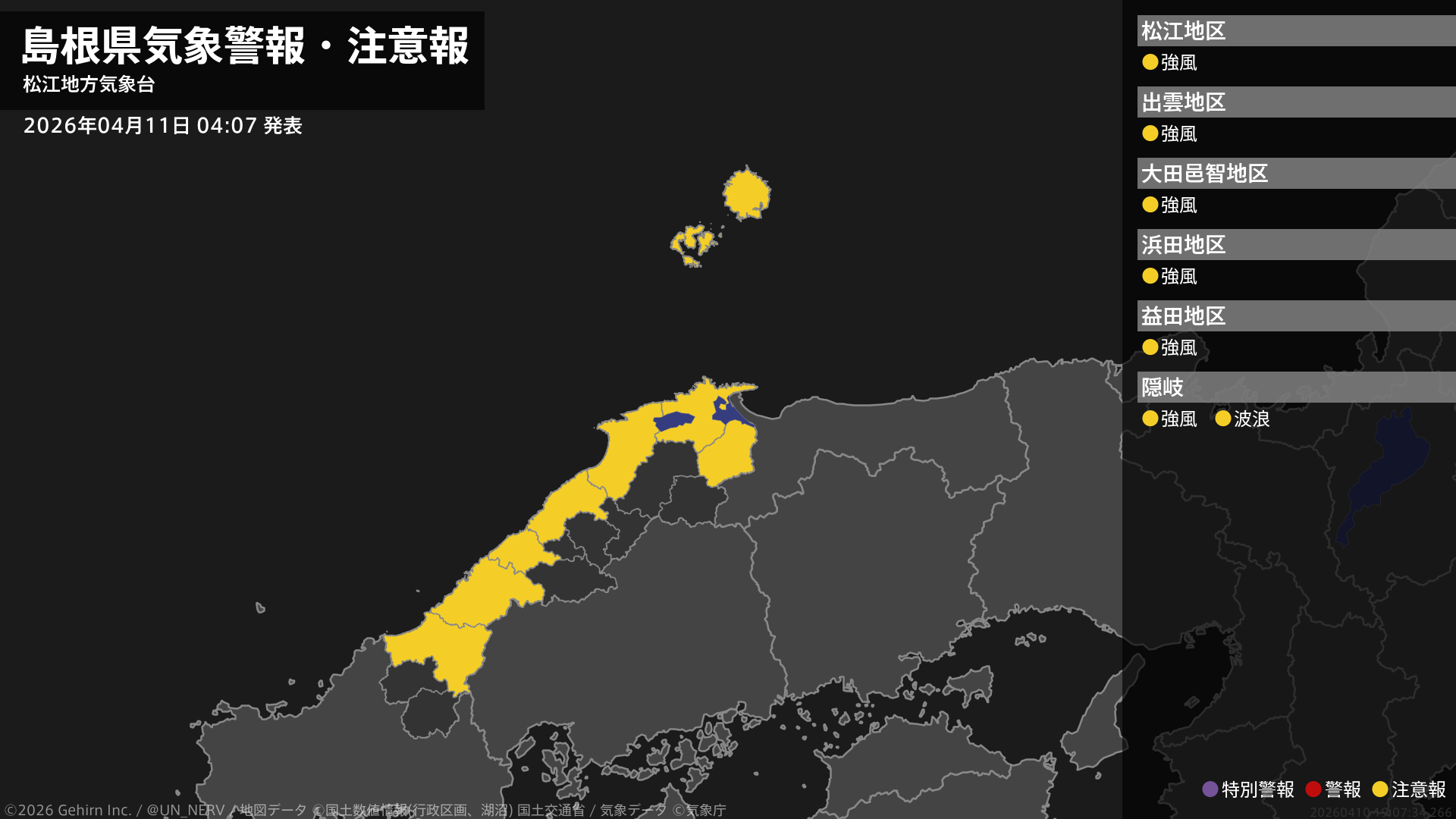 【島根県 気象警報・注意報 2026年04月11日 04:07】