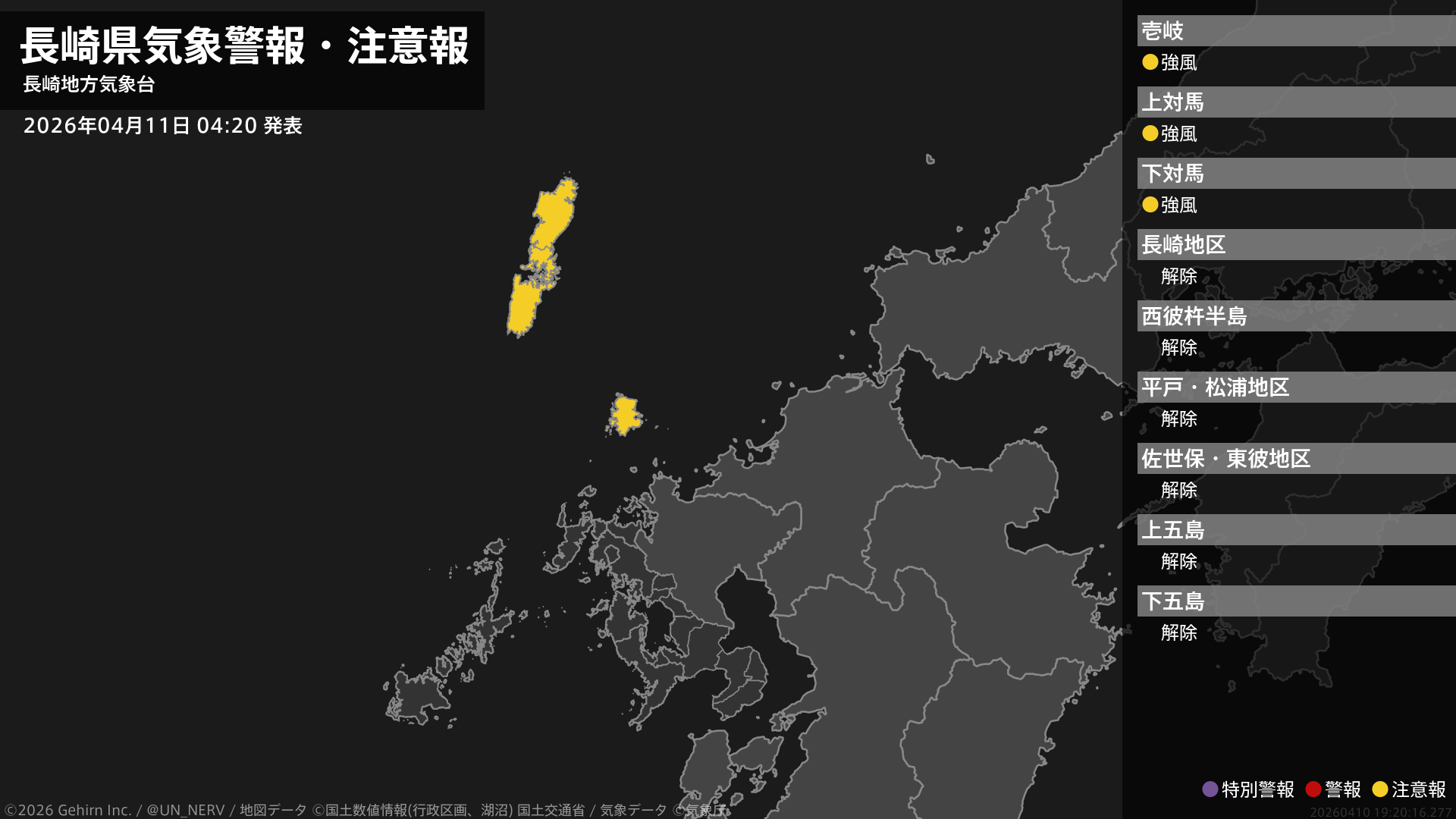 【長崎県 気象警報・注意報 2026年04月11日 04:20】