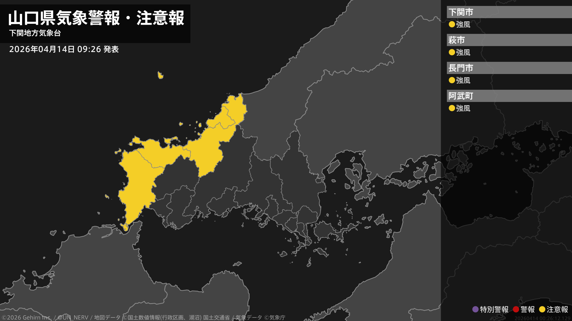 【山口県 気象警報・注意報 2026年04月14日 09:26】