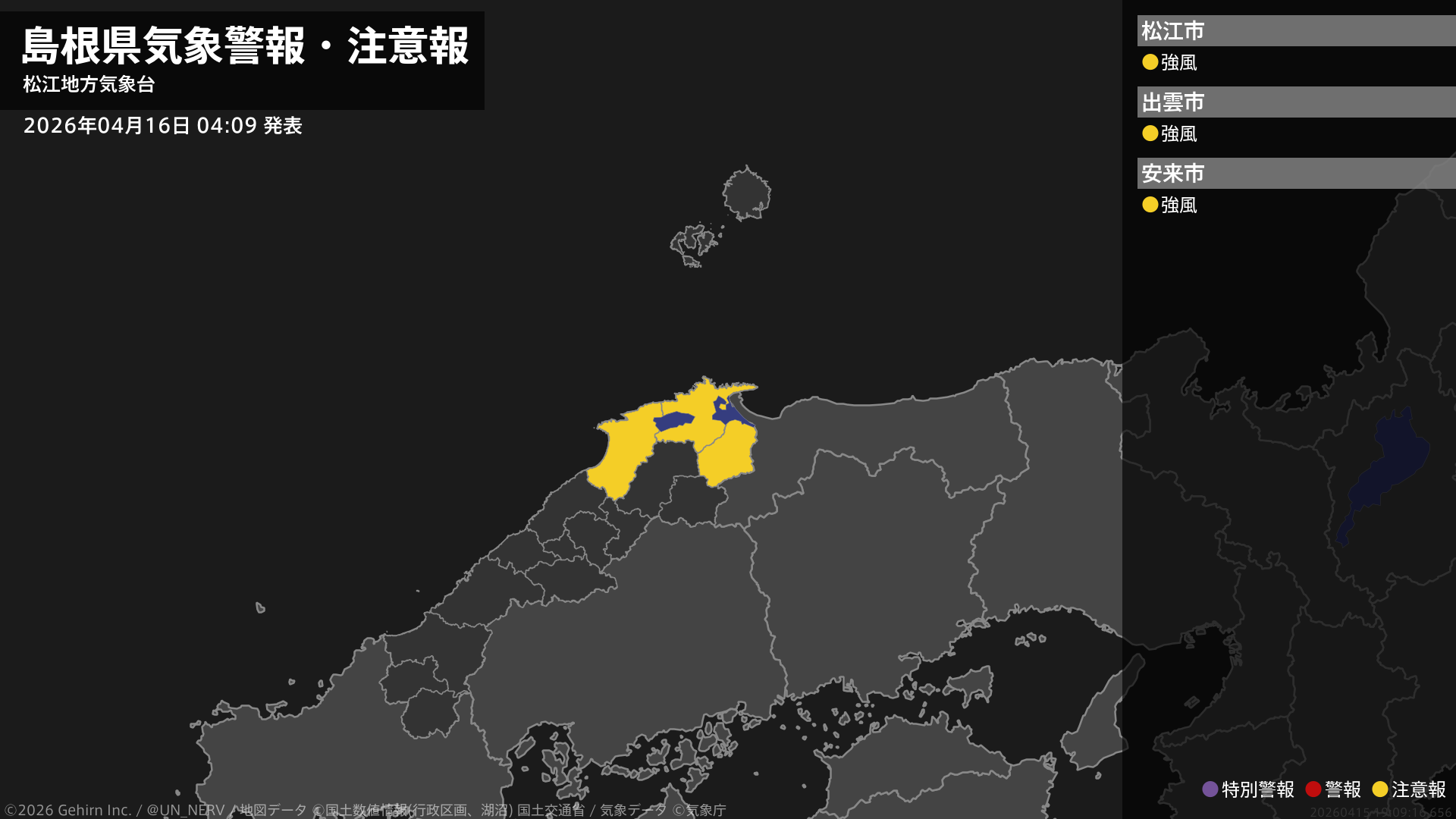 【島根県 気象警報・注意報 2026年04月16日 04:09】東部では、16日昼前から16日夕方まで強風に注意してください。#気象警報注意報 #島根県