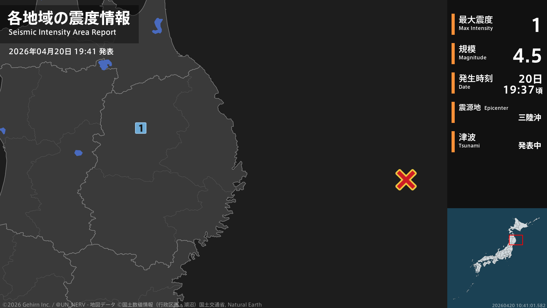 【緊急地震速報 第1報 2026年4月20日】