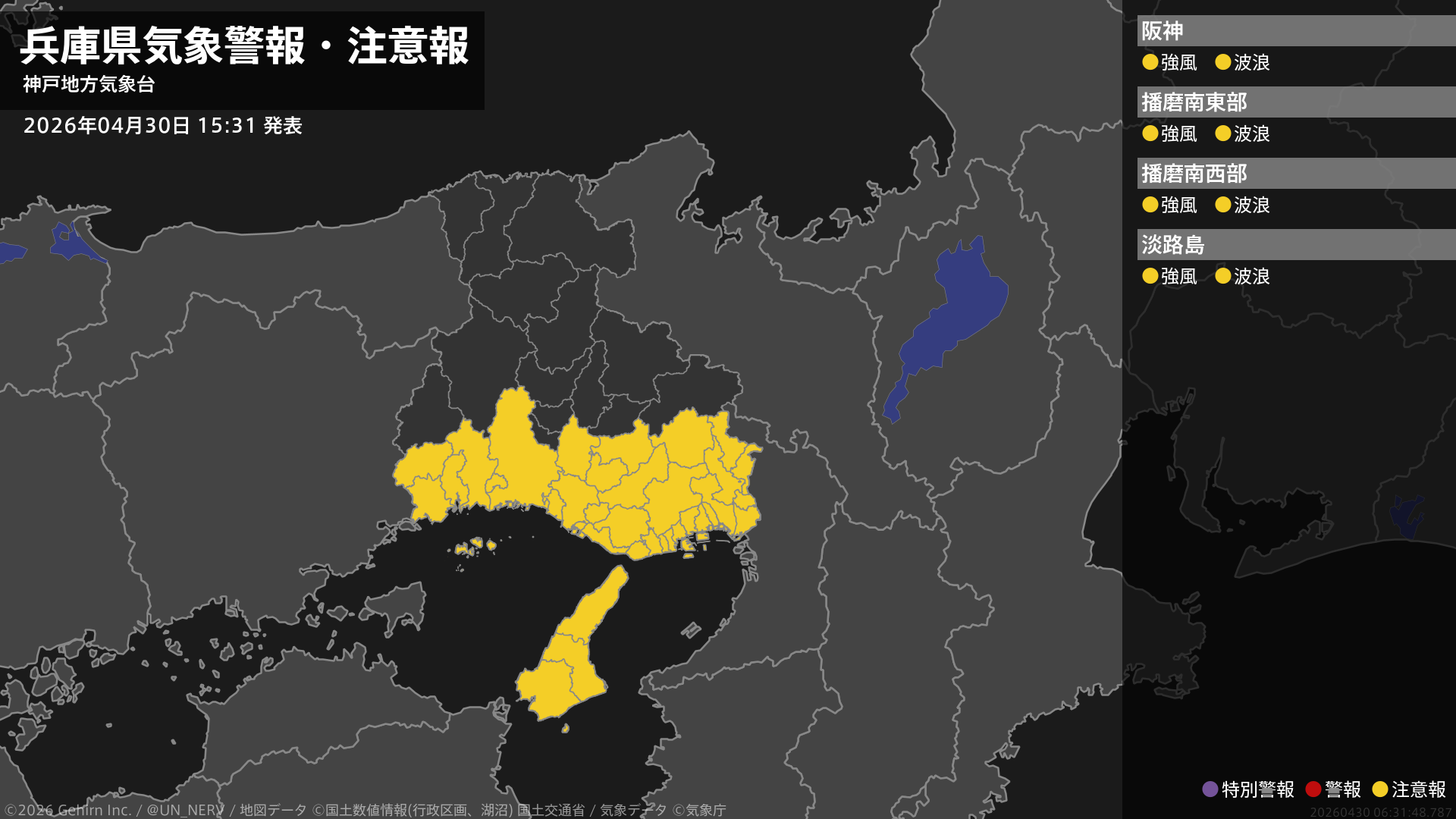 【兵庫県 気象警報・注意報 2026年04月30日 15:31】南部では、30日夜のはじめ頃から強風や高波に注意してください。#気象警報注意報 #兵庫県