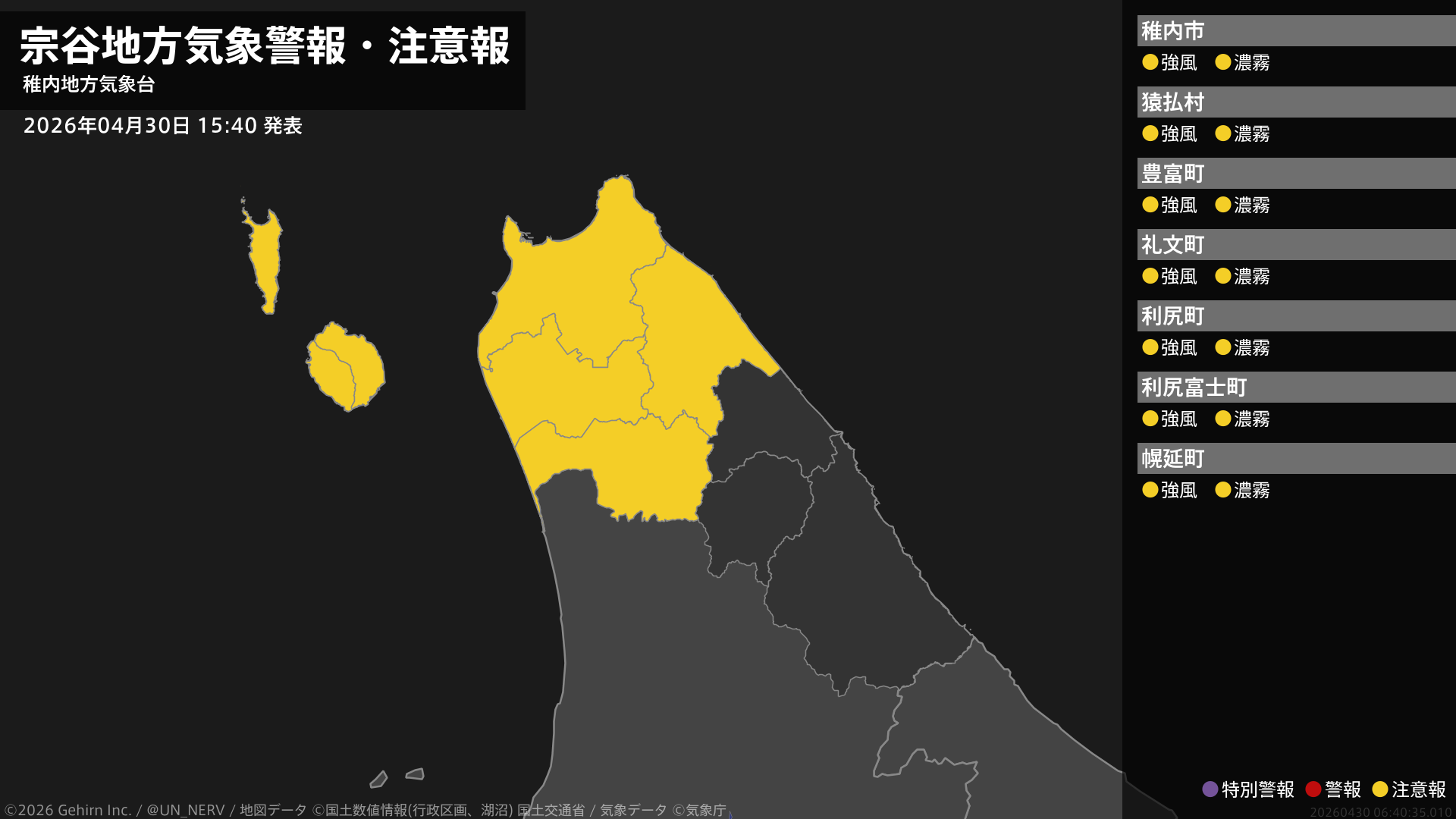 【宗谷地方 気象警報・注意報 2026年04月30日 15:40】宗谷地方では、30日夜遅くから1日夕方まで強風に、1日昼前まで濃霧による視程障害に注意してください。#気象警報注意報 #宗谷地方