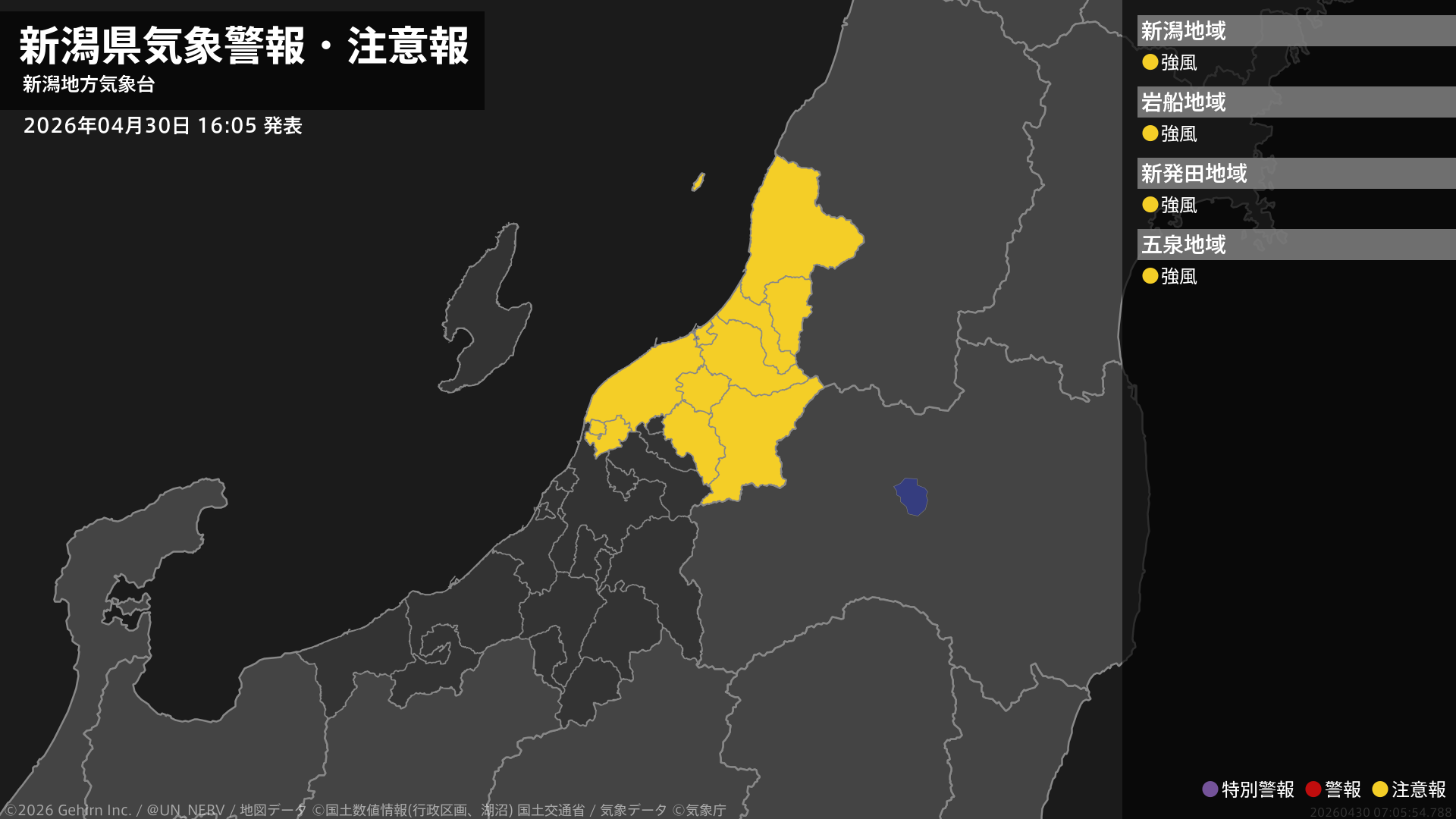 【新潟県 気象警報・注意報 2026年04月30日 16:05】下越では、1日明け方から強風に注意してください。#気象警報注意報 #新潟県