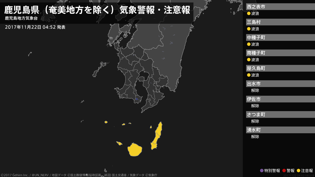 【鹿児島県(奄美地方を除く) 気象警報・注意報 2017年11月22日 04:53】種子島・屋久島地方では、22日昼前から高波に注意してください。#気象警報注意報 #鹿児島県(奄美地方除く)