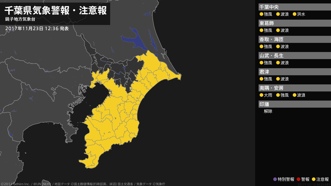 【千葉県 気象警報(解除) 2017年11月23日 12:36】千葉県に発表されていた気象警報はすべて解除されました。#気象警報 #千葉県
