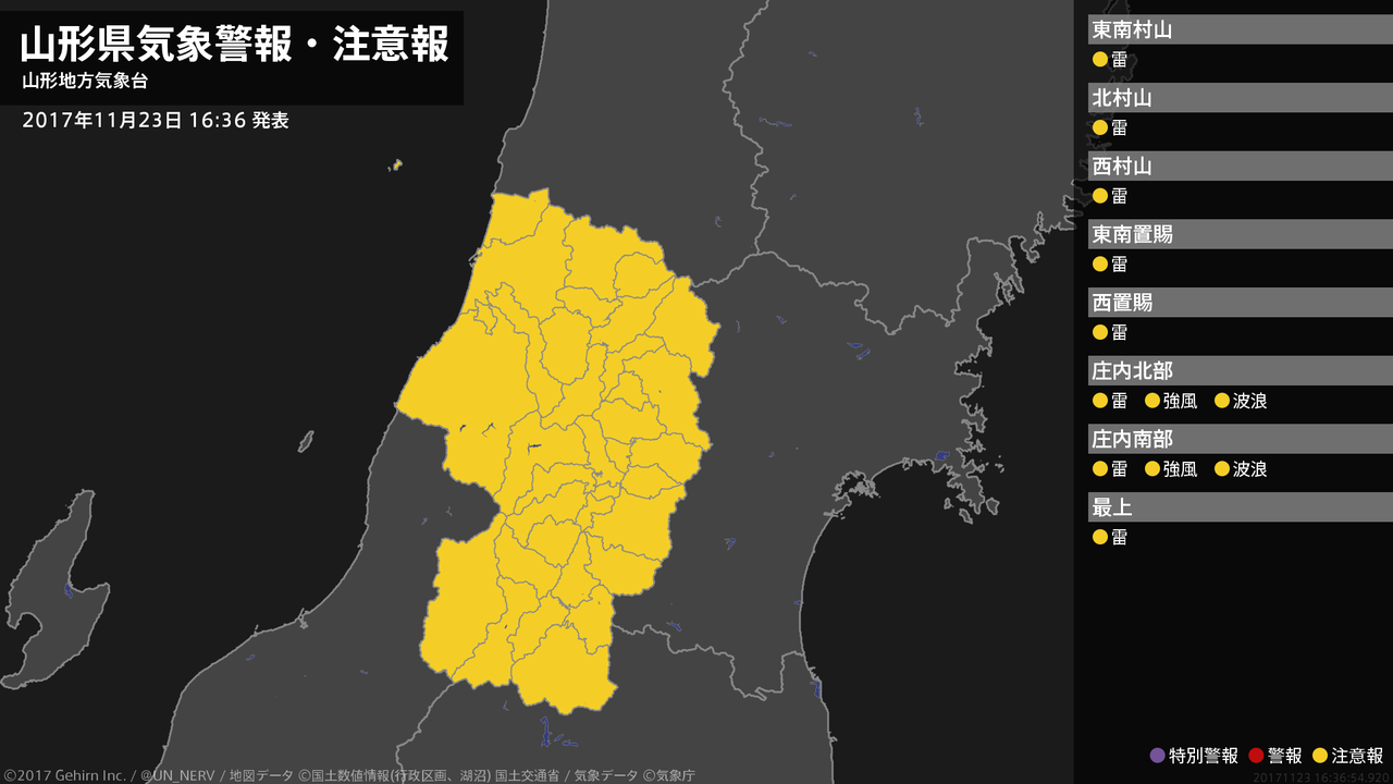 【山形県 気象警報・注意報 2017年11月23日 16:37】