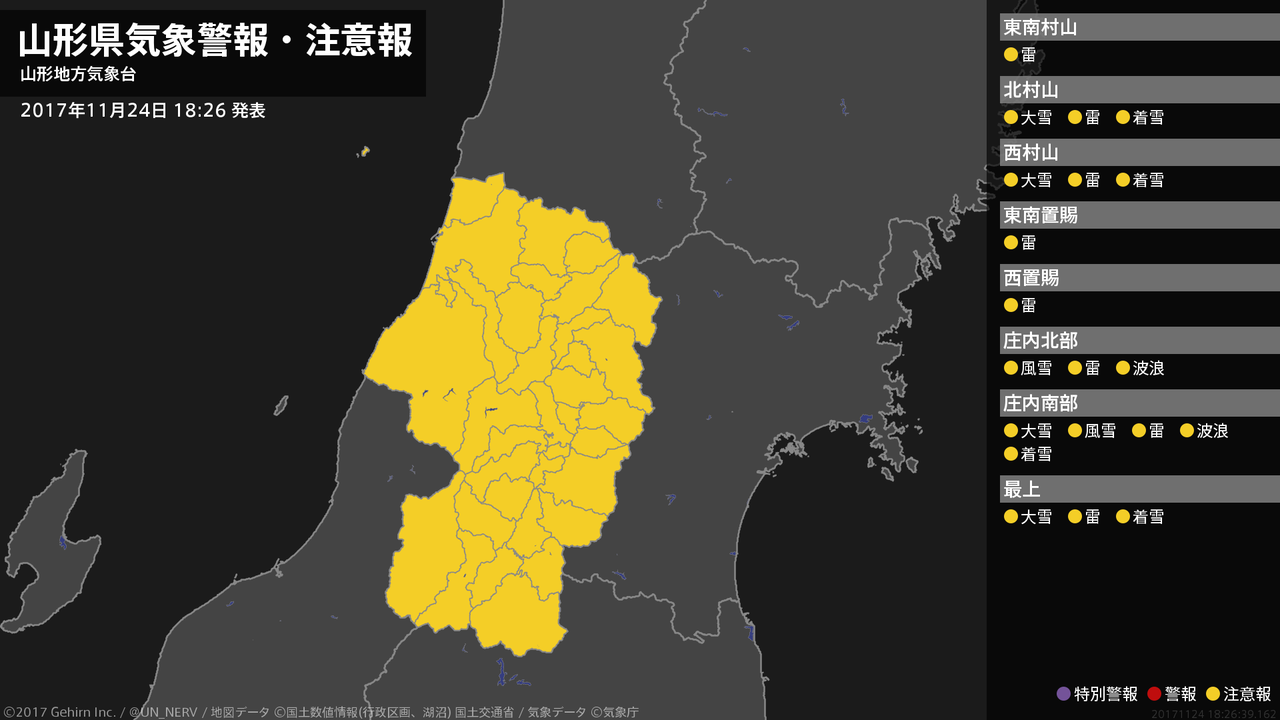 【山形県 気象警報・注意報 2017年11月24日 18:26】庄内では、風雪や高波に注意してください。村山、庄内、最上では、大雪や電線等への着雪に注意してください。山形県では、落雷に注意してください。#気象警報注意報 #山形県