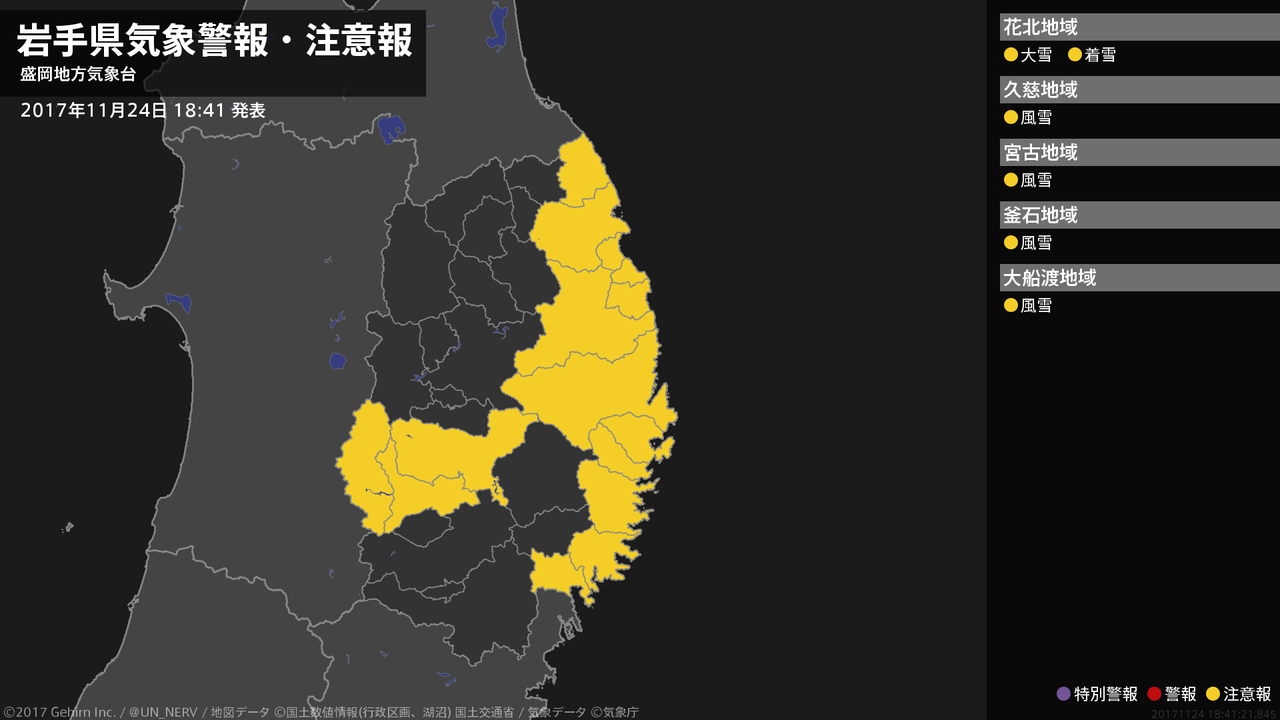 【岩手県 気象警報・注意報 2017年11月24日 18:41】沿岸北部、沿岸南部では、25日夕方まで風雪に注意してください。内陸では、25日明け方まで大雪や電線等への着雪に注意してください。#気象警報注意報 #岩手県