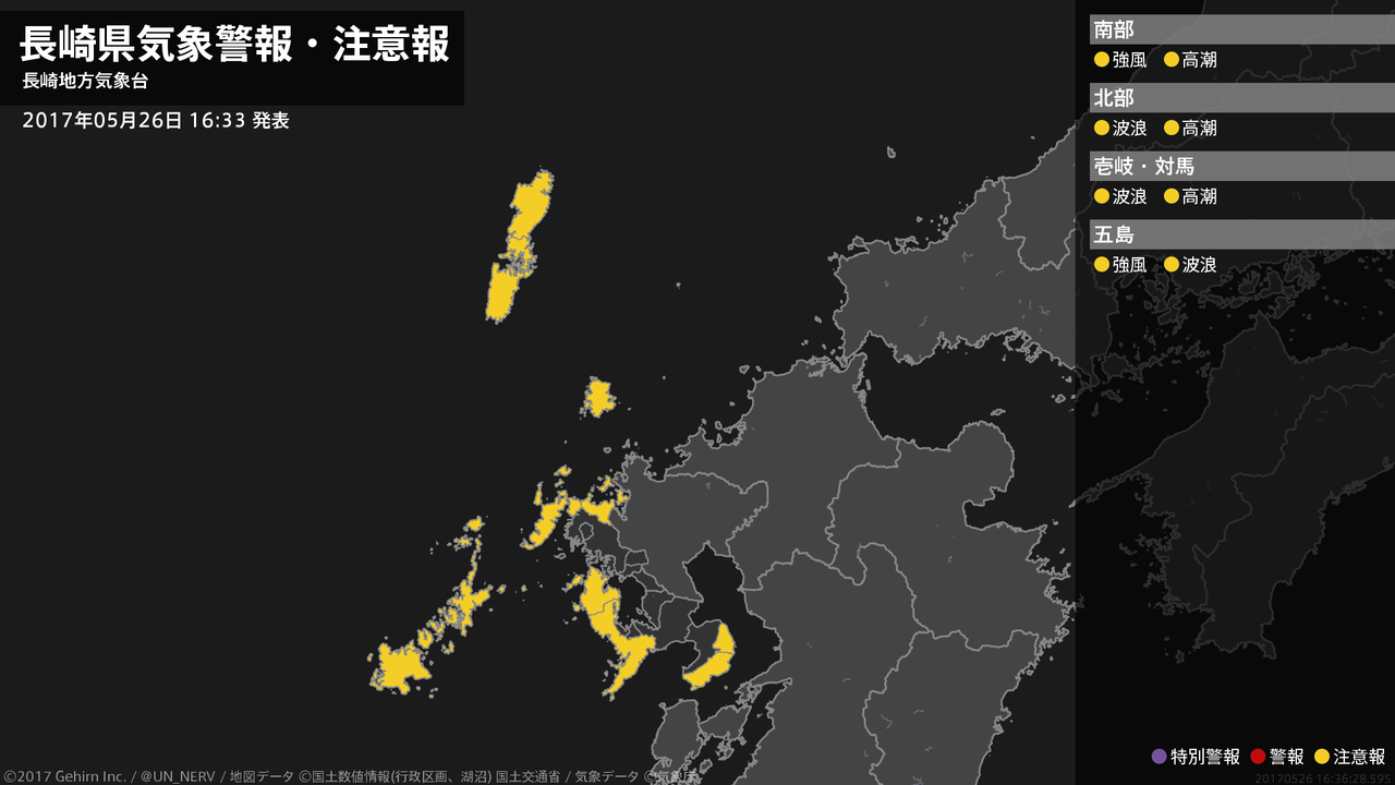 【長崎県 気象警報・注意報 2017年05月26日 16:36】南部、五島では、強風に注意してください。北部、壱岐・対馬、五島では、高波に注意してください。南部、北部、壱岐・対馬では、高潮に注意してください。#気象警報注意報 #長崎県