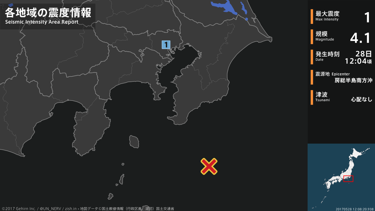 【地震情報 2017年5月28日】12時04分頃、房総半島南方沖を震源とする地震がありました。震源の深さは約80km、地震の規模はM4.1、最大震度1を東京都で観測しています。この地震による津波の心配はありません。#地震 #東京都